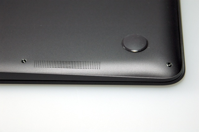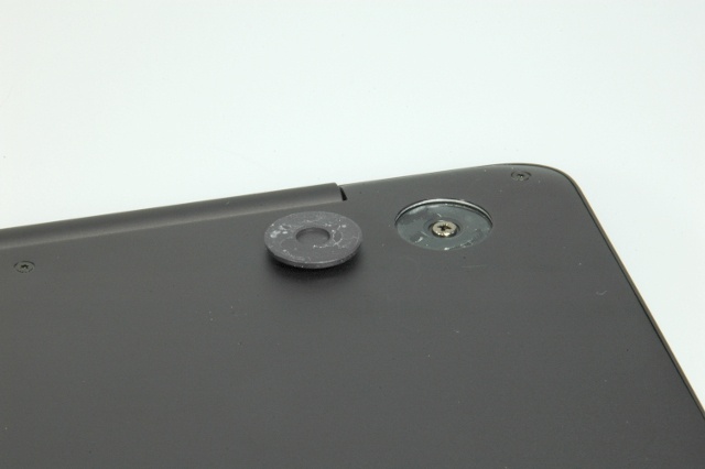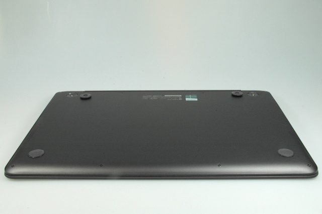 Aan de onderkant bevinden zich een viertal rubberen apparaatvoetjes. De onderzijde is met 10 Torx T5 schroeven aan de bovenzijde van de behuizing gemonteerd. Dit is echter niet het hele verhaal, want onder de twee achterste apparaatvoetjes (bij het scharmier) bevinden zich nog twee PH1 kruiskopschroeven. Wil je dus die bodem loshalen, dan heb je dus wat te peuteren en los te schroeven. Voordeel is wel dat door het gebruik van aluminium geen verende klikverbindingen zijn gebruikt die kapot kunnen. Bij een kunststof laptop bodem bestaat hierop een kans. Na het losschroeven wipt de bodem met behulp van een plectrum of een andere opening tool eenvoudig open.