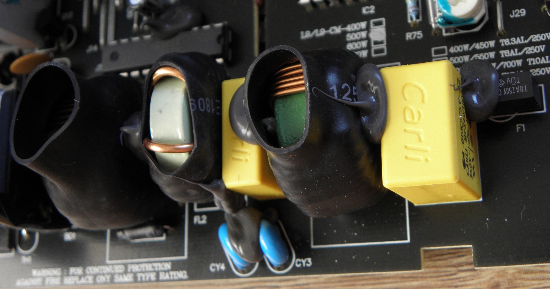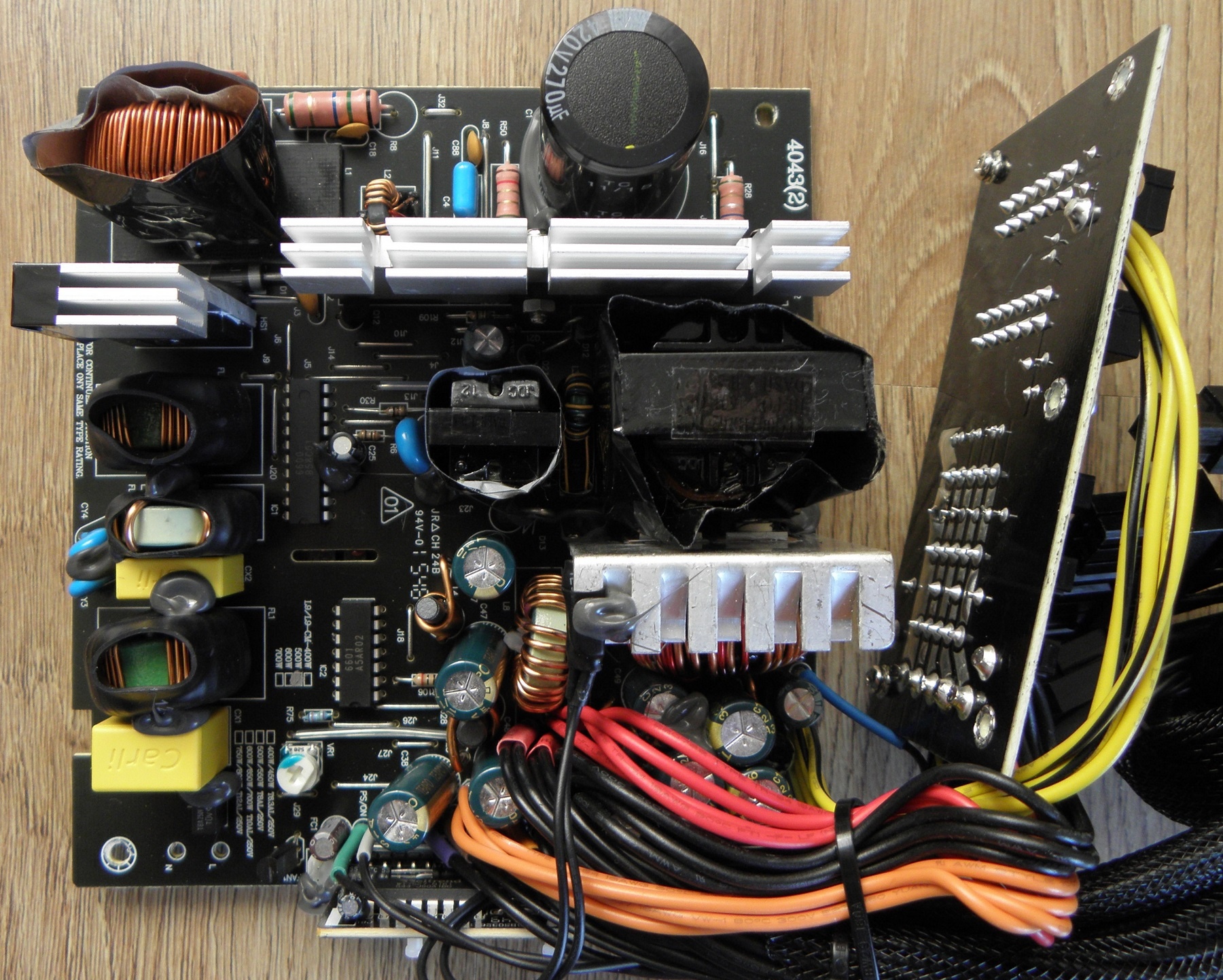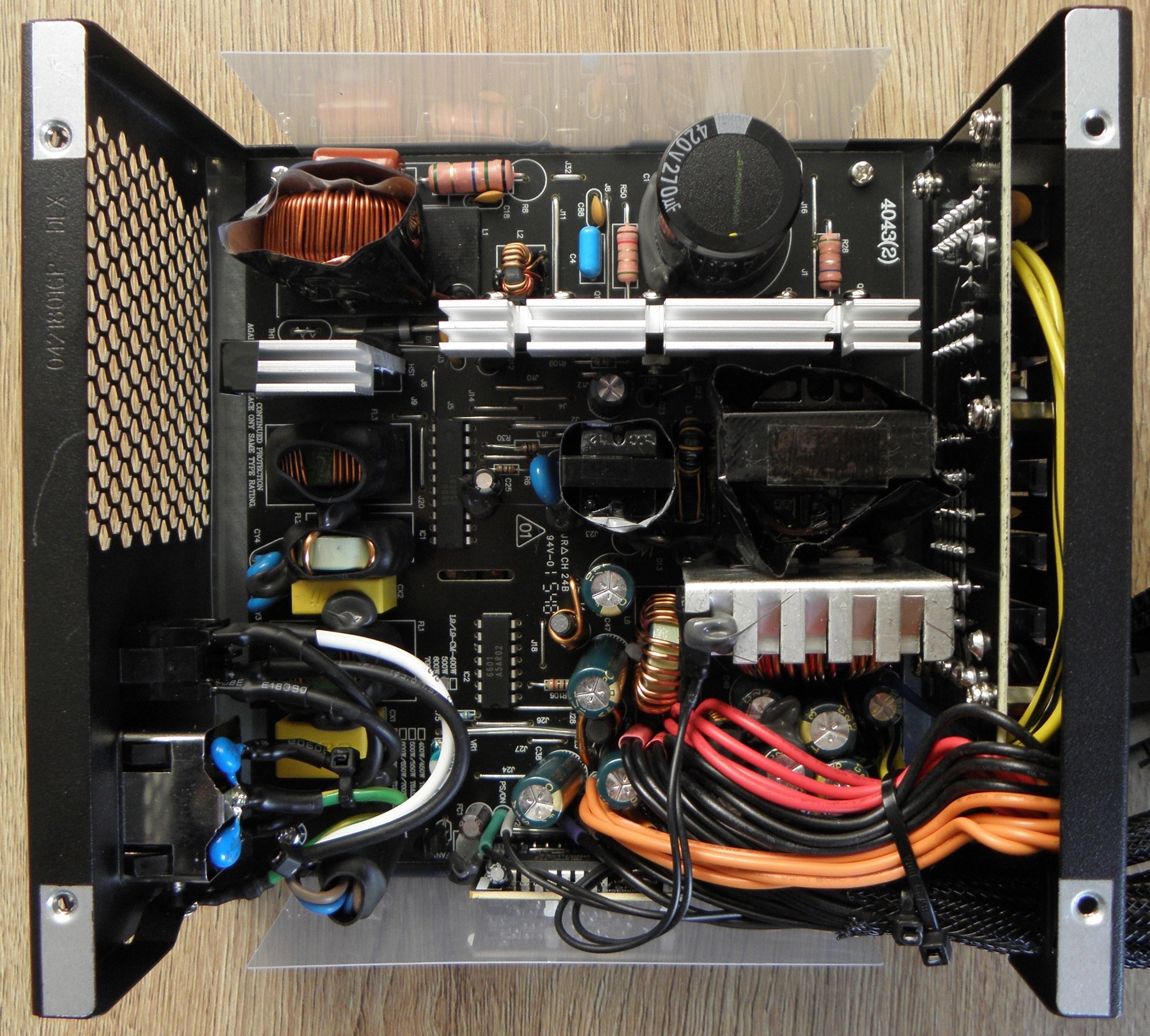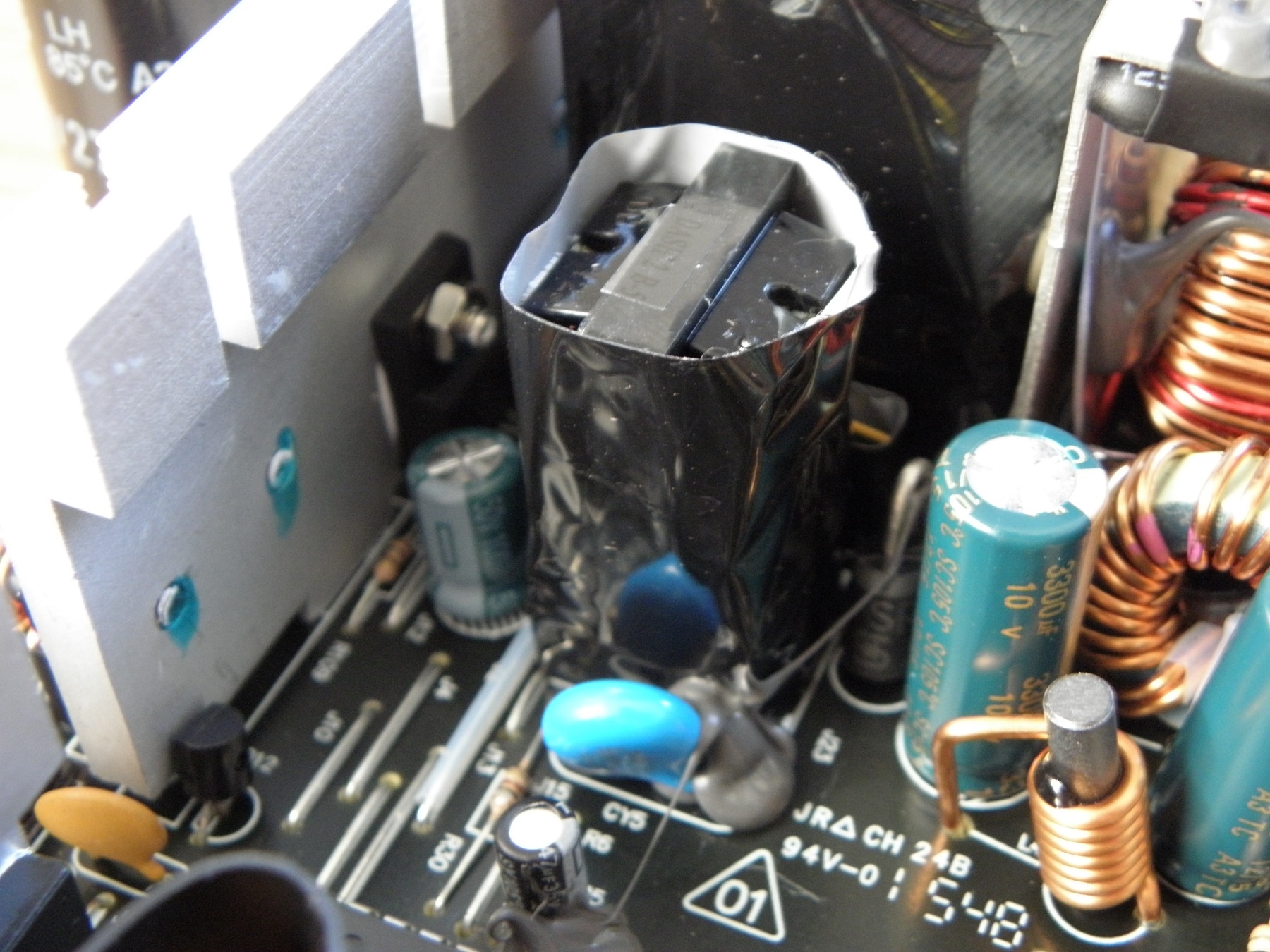 DE FAN De fan van de voeding is een belangrijk onderdeel. Zo moet de fan genoeg airflow bieden om de voeding koel te houden. Als de voeding namelijk te warm wordt kan dit negatieve gevolgen hebben op de prestatie van de voeding. En als er een onderdeel echt veel te warm wordt kan die zelfs stuk gaan, waarbij het mogelijk is dat er schade aan de PC ontstaat. Naast genoeg airflow is de kwaliteit van het lager ook belangrijk, dit bepaalt namelijk hoe lang de fan mee gaat. Een echt goed lager kan tientallen jaren mee, terwijl een slecht lager al na een paar jaar versleten kan zijn. Naast dat is er natuurlijk ook het verschil in geluid. Lagers zelf maken geluid, maar ook de fan en het rooster kunnen door luchtstromen geluid maken. ![]() De fan in de voeding is een be quiet! BQ QF1-12025-MS sleeve bearing fan. Het nadeel van dit type lager is dat de verwachte levensduur het kortst is van alle types die in computerventilatoren aan zult treffen. Stil is de ventilator echter wel en met een maximale snelheid van 1600 RPM kan die ook zelfs in de meest zware omstandigheden niet extreem veel geluid produceren. De 1600 RPM wordt overigens niet behaald bij volledige belasting van de voeding mits de omgevingstemperatuur niet extreem hoog is. TOTAALBEELD INTERN Als eerste een plaatje van hoe de voeding er van binnen uitziet. Bij het openen van de voeding verlies je overigens de garantie, je hebt er daarnaast vaak ook niks aan en open de voeding ook zeker niet terwijl de stekker nog in het stopcontact zit! ![]() ![]() Deze voeding wordt door FSP geproduceerd en is gebaseerd op het Raider platform van FSP. Raider is een cost down versie van Aurum S welke een 80PLUS Gold certificaat heeft. De gehele be quiet! Pure Power 9 CM serie maakt overigens gebruik van dit platform, de gehele niet modulaire Pure Power 9 serie overigens niet, de 300W en 350W versies zijn namelijk andere voedingen. FSP Raider en ook Aurum S kenmerkt zich door het hoge rendement bij lage belastingen, maar ook door de extreem slechte spanningsregulatie, deze voeding is helaas geen uitzondering zoals later in deze review zal blijken. De voeding maakt gebruik van Active Clamp Reset Forward design aan de primaire kant van de voeding. FSP gebruikt dit platform veel in hun voedingen doordat voedingen hierop gebaseerd vrij goedkoop zijn te maken en toch een hoog rendement kunnen leveren. Qua prestaties zal een Active Clamp Reset Forward voeding echter nooit het beste jongetje van de klas zijn, maar voor een voeding in een lagere prijscategorie is dit ook geen probleem. Aan de secondaire kant van de voeding wordt gebruik gemaakt van Synchrone Rectificatie, maar DC-DC heeft de voeding echter niet. De 12V en 5V zijn dan ook nog eens niet individueel van elkaar gereguleerd wat er voor zorgt dat de spanningsstabiliteit zwaar tegenvalt. Om het een interessante voeding te maken hadden ze minimaal er voor moeten zorgen dat de spanningen individueel gereguleerd konden worden zodat de spanningsstabiliteit niet zo te wensen overlaat als nu het geval is. EMI FILTER De voeding begint altijd met een EMI filter. Dit is een belangrijk filter, het filtert namelijk storing die van buitenaf de voeding in wil komen weg. Maar het werkt ook andersom, eventuele storing die de voeding afgeeft wordt ook weggefilterd door het EMI filter. Bij goedkope voedingen wil hier nogal eens op bespaart worden, door het weglaten van enkele componenten. Een enkele keer, bij de meest grote wanproducten, wordt het EMI filter helemaal weggelaten, i.p.v. dat er een aantal componenten missen. Zoals je wel kan bedenken is dat erg onverstandig, aangezien het van allerhande storing en problemen kan veroorzaken en daarnaast is het ook gewoon onveilig. ![]() Het EMI filter begint zoals wel vaker met twee Y-condensators over de fase en ground en nul en ground staan. ![]() ![]() Vanaf de dubbelpolige schakelaar gaan de fase en nul door een ferrietring, na de ferrietring worden de fase en nul aan het PCB gesoldeerd. Vanaf daar bevindt de zekering zich als eerste op het PCB. Dit is een in tegenstelling tot wat je normaal zou zien geen glaszekering maar een kleine zwarte plastic blokje, zichtbaar rechts op de foto's hierboven. Naast de zekering zit een gele X-condensators, daarnaast een common mode smoorspoel, een kleinere X-condensator, twee blauwe Y-condensators, ringkern spoel en nog een common mode smoorspoel. Als beveiliging tegen spanningspieken wordt geen MOV gebruikt maar een gasontladingsbuis (Gas Discharge Tube) van Mitsubishi gehuld in krimpkous. Deze gasontladingsbuis is zichtbaar voor de laatste common mode smoorspoel, de meest linker. Daarmee is het EMI filter compleet, maar worden er wel andere componenten gebruikt voor de overspanningsbeveiliging en zekering dan gebruikelijk. PFC CIRCUIT Van het EMI filter gaan we naar het PFC. Het PFC circuit behoort net als het EMI filter tot de primaire kant van de voeding. Hier wordt de frequentie verhoogt tot de meest ideale waarde voor de transformator. Ook wordt er voor gezorgd dat de stroom en spanning zoveel mogelijk in fase lopen en dit alles met zo weinig mogelijk verlies om zo een relatief hoog rendement te kunnen halen. ![]() De bruggelijkrichter, ook wel diodebrug genoemd, zorgt er voor dat de wisselspanning wordt omgezet naar een pulserende gelijkspanning. De spanning wordt niet meer negatief, maar gaat steeds van de maximale waarde naar 0V zonder negatief te worden. Het precieze type is echter niet zichtbaar doordat de tekst aan de kant zit van de heat sink. ![]() Op bovenstaande foto zie je de APFC spoel welke omhult is door metaal welke storingen tegen moet gaan en daaromheen een laagje zwarte tape ter isolatie. Voor de spoel is nog een condensator zichtbaar en links daarvan zie je een relatief grootte weerstand. ![]() De primaire condensator, ook wel hold-up condensator genoemd, is een Teapo uit de LH serie met een capaciteit van 270μF, een maximale spanning van 420V en een maximale temperatuurrating van 85℃. Met een verwachte