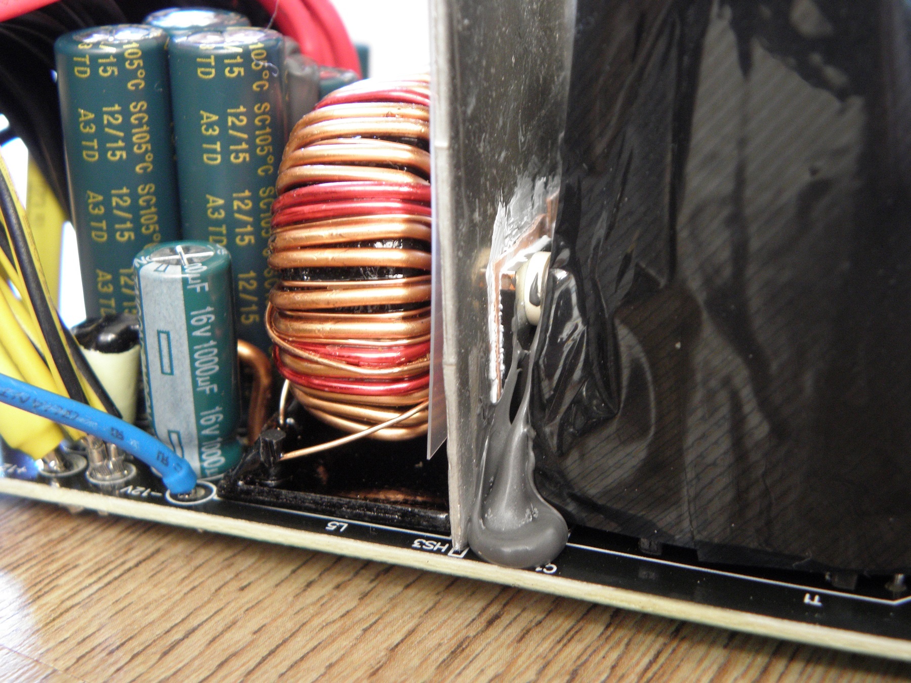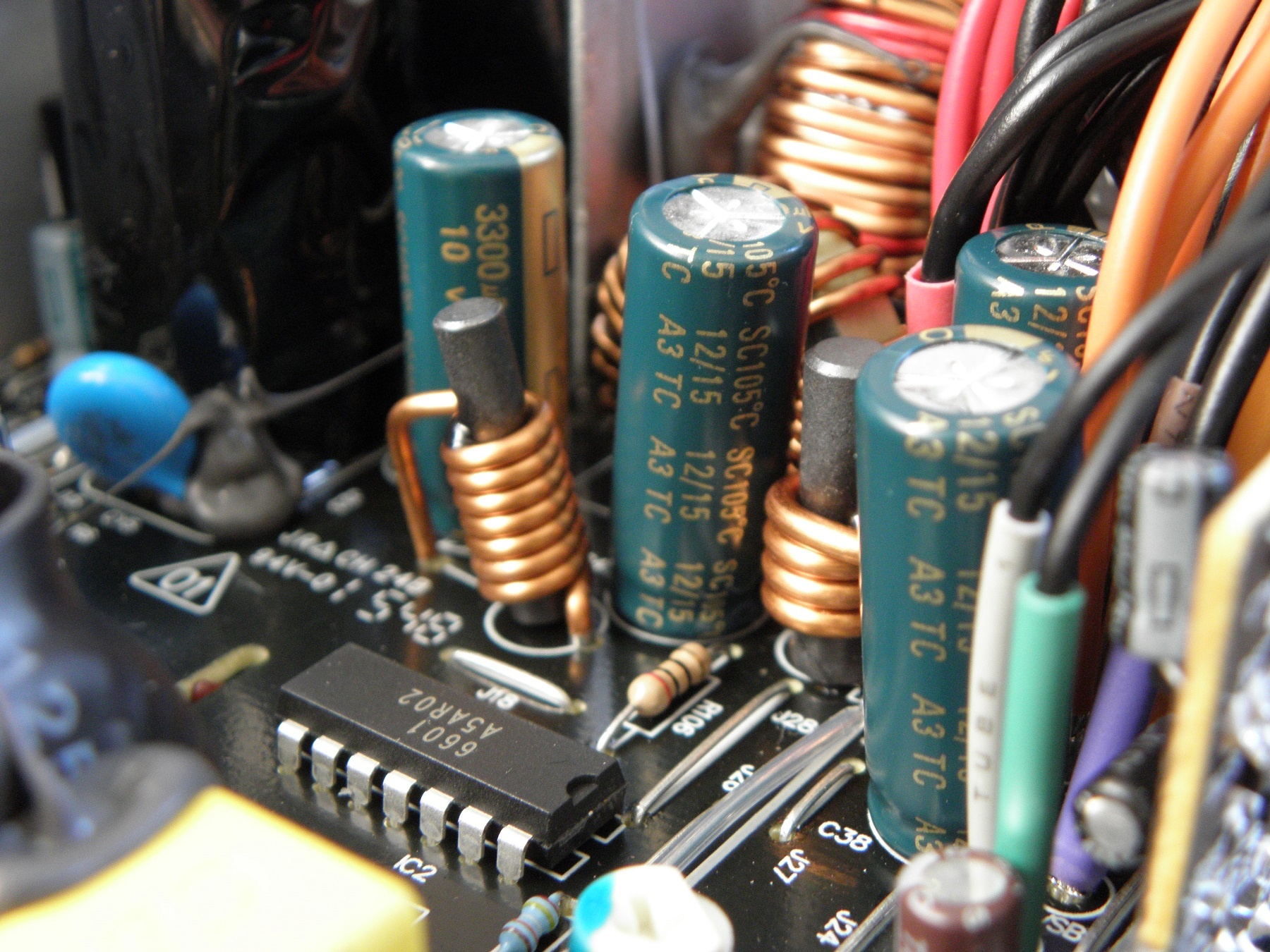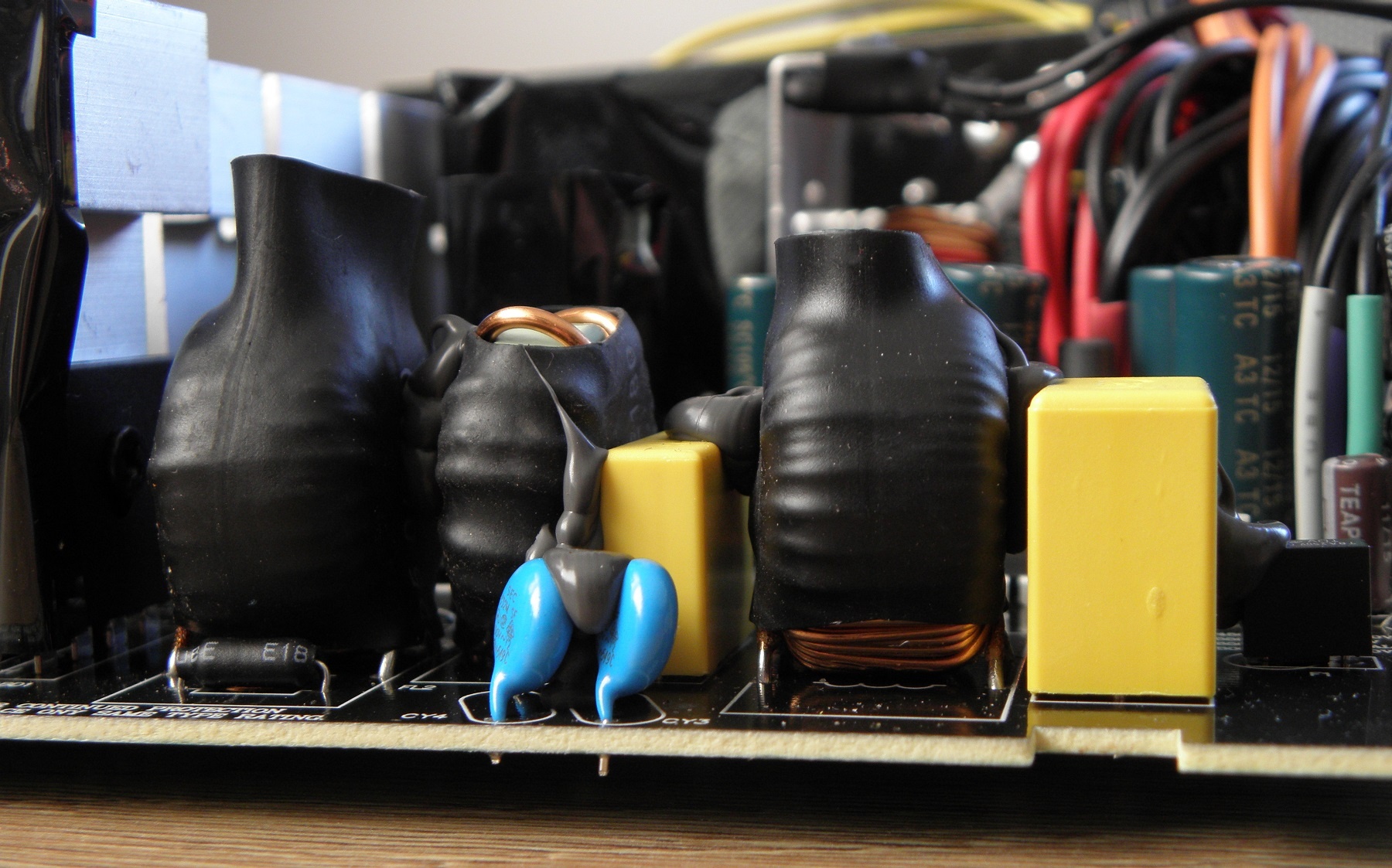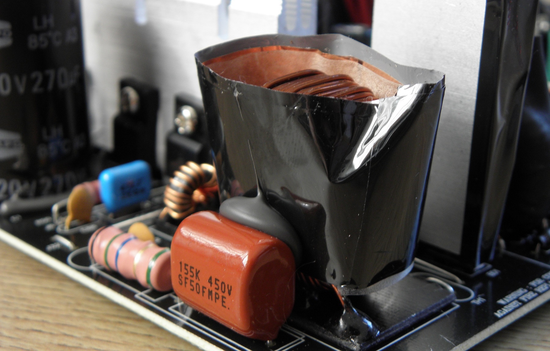 DE FAN De fan van de voeding is een belangrijk onderdeel. Zo moet de fan genoeg airflow bieden om de voeding koel te houden. Als de voeding namelijk te warm wordt kan dit negatieve gevolgen hebben op de prestatie van de voeding. En als er een onderdeel echt veel te warm wordt kan die zelfs stuk gaan, waarbij het mogelijk is dat er schade aan de PC ontstaat. Naast genoeg airflow is de kwaliteit van het lager ook belangrijk, dit bepaalt namelijk hoe lang de fan mee gaat. Een echt goed lager kan tientallen jaren mee, terwijl een slecht lager al na een paar jaar versleten kan zijn. Naast dat is er natuurlijk ook het verschil in geluid. Lagers zelf maken geluid, maar ook de fan en het rooster kunnen door luchtstromen geluid maken. ![]() De fan in de voeding is een be quiet! BQ QF1-12025-MS sleeve bearing fan. Het nadeel van dit type lager is dat de verwachte levensduur het kortst is van alle types die in computerventilatoren aan zult treffen. Stil is de ventilator echter wel en met een maximale snelheid van 1600 RPM kan die ook zelfs in de meest zware omstandigheden niet extreem veel geluid produceren. De 1600 RPM wordt overigens niet behaald bij volledige belasting van de voeding mits de omgevingstemperatuur niet extreem hoog is. TOTAALBEELD INTERN Als eerste een plaatje van hoe de voeding er van binnen uitziet. Bij het openen van de voeding verlies je overigens de garantie, je hebt er daarnaast vaak ook niks aan en open de voeding ook zeker niet terwijl de stekker nog in het stopcontact zit! ![]() ![]() Deze voeding wordt door FSP geproduceerd en is gebaseerd op het Raider platform van FSP. Raider is een cost down versie van Aurum S welke een 80PLUS Gold certificaat heeft. De gehele be quiet! Pure Power 9 CM serie maakt overigens gebruik van dit platform, de gehele niet modulaire Pure Power 9 serie overigens niet, de 300W en 350W versies zijn namelijk andere voedingen. FSP Raider en ook Aurum S kenmerkt zich door het hoge rendement bij lage belastingen, maar ook door de extreem slechte spanningsregulatie, deze voeding is helaas geen uitzondering zoals later in deze review zal blijken. De voeding maakt gebruik van Active Clamp Reset Forward design aan de primaire kant van de voeding. FSP gebruikt dit platform veel in hun voedingen doordat voedingen hierop gebaseerd vrij goedkoop zijn te maken en toch een hoog rendement kunnen leveren. Qua prestaties zal een Active Clamp Reset Forward voeding echter nooit het beste jongetje van de klas zijn, maar voor een voeding in een lagere prijscategorie is dit ook geen probleem. Aan de secondaire kant van de voeding wordt gebruik gemaakt van Synchrone Rectificatie, maar DC-DC heeft de voeding echter niet. De 12V en 5V zijn dan ook nog eens niet individueel van elkaar gereguleerd wat er voor zorgt dat de spanningsstabiliteit zwaar tegenvalt. Om het een interessante voeding te maken hadden ze minimaal er voor moeten zorgen dat de spanningen individueel gereguleerd konden worden zodat de spanningsstabiliteit niet zo te wensen overlaat als nu het geval is. EMI FILTER De voeding begint altijd met een EMI filter. Dit is een belangrijk filter, het filtert namelijk storing die van buitenaf de voeding in wil komen weg. Maar het werkt ook andersom, eventuele storing die de voeding afgeeft wordt ook weggefilterd door het EMI filter. Bij goedkope voedingen wil hier nogal eens op bespaart worden, door het weglaten van enkele componenten. Een enkele keer, bij de meest grote wanproducten, wordt het EMI filter helemaal weggelaten, i.p.v. dat er een aantal componenten missen. Zoals je wel kan bedenken is dat erg onverstandig, aangezien het van allerhande storing en problemen kan veroorzaken en daarnaast is het ook gewoon onveilig. ![]() Het EMI filter begint zoals wel vaker met twee Y-condensators over de fase en ground en nul en ground staan. ![]() ![]() Vanaf de dubbelpolige schakelaar gaan de fase en nul door een ferrietring, na de ferrietring worden de fase en nul aan het PCB gesoldeerd. Vanaf daar bevindt de zekering zich als eerste op het PCB. Dit is een in tegenstelling tot wat je normaal zou zien geen glaszekering maar een kleine zwarte plastic blokje, zichtbaar rechts op de foto's hierboven. Naast de zekering zit een gele X-condensators, daarnaast een common mode smoorspoel, een kleinere X-condensator, twee blauwe Y-condensators, ringkern spoel en nog een common mode smoorspoel. Als beveiliging tegen spanningspieken wordt geen MOV gebruikt maar een gasontladingsbuis (Gas Discharge Tube) van Mitsubishi gehuld in krimpkous. Deze gasontladingsbuis is zichtbaar voor de laatste common mode smoorspoel, de meest linker. Daarmee is het EMI filter compleet, maar worden er wel andere componenten gebruikt voor de overspanningsbeveiliging en zekering dan gebruikelijk. PFC CIRCUIT Van het EMI filter gaan we naar het PFC. Het PFC circuit behoort net als het EMI filter tot de primaire kant van de voeding. Hier wordt de frequentie verhoogt tot de meest ideale waarde voor de transformator. Ook wordt er voor gezorgd dat de stroom en spanning zoveel mogelijk in fase lopen en dit alles met zo weinig mogelijk verlies om zo een relatief hoog rendement te kunnen halen. ![]() De bruggelijkrichter, ook wel diodebrug genoemd, zorgt er voor dat de wisselspanning wordt omgezet naar een pulserende gelijkspanning. De spanning wordt niet meer negatief, maar gaat steeds van de maximale waarde naar 0V zonder negatief te worden. Het precieze type is echter niet zichtbaar doordat de tekst aan de kant zit van de heat sink. ![]() Op bovenstaande foto zie je de APFC spoel welke omhult is door metaal welke storingen tegen moet gaan en daaromheen een laagje zwarte tape ter isolatie. Voor de spoel is nog een condensator zichtbaar en links daarvan zie je een relatief grootte weerstand. ![]() De primaire condensator, ook wel hold-up condensator genoemd, is een Teapo uit de LH serie met een capaciteit van 270μF, een maximale spanning van 420V en een maximale temperatuurrating van 85℃. Met een verwachte