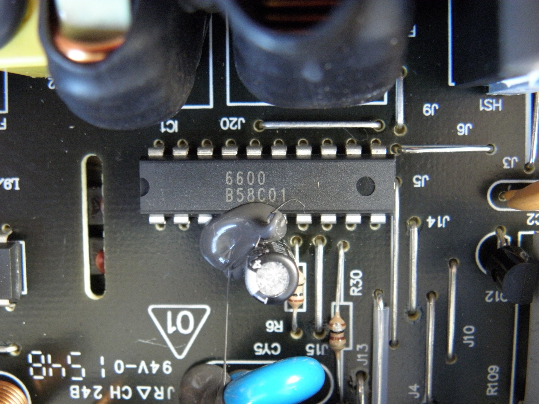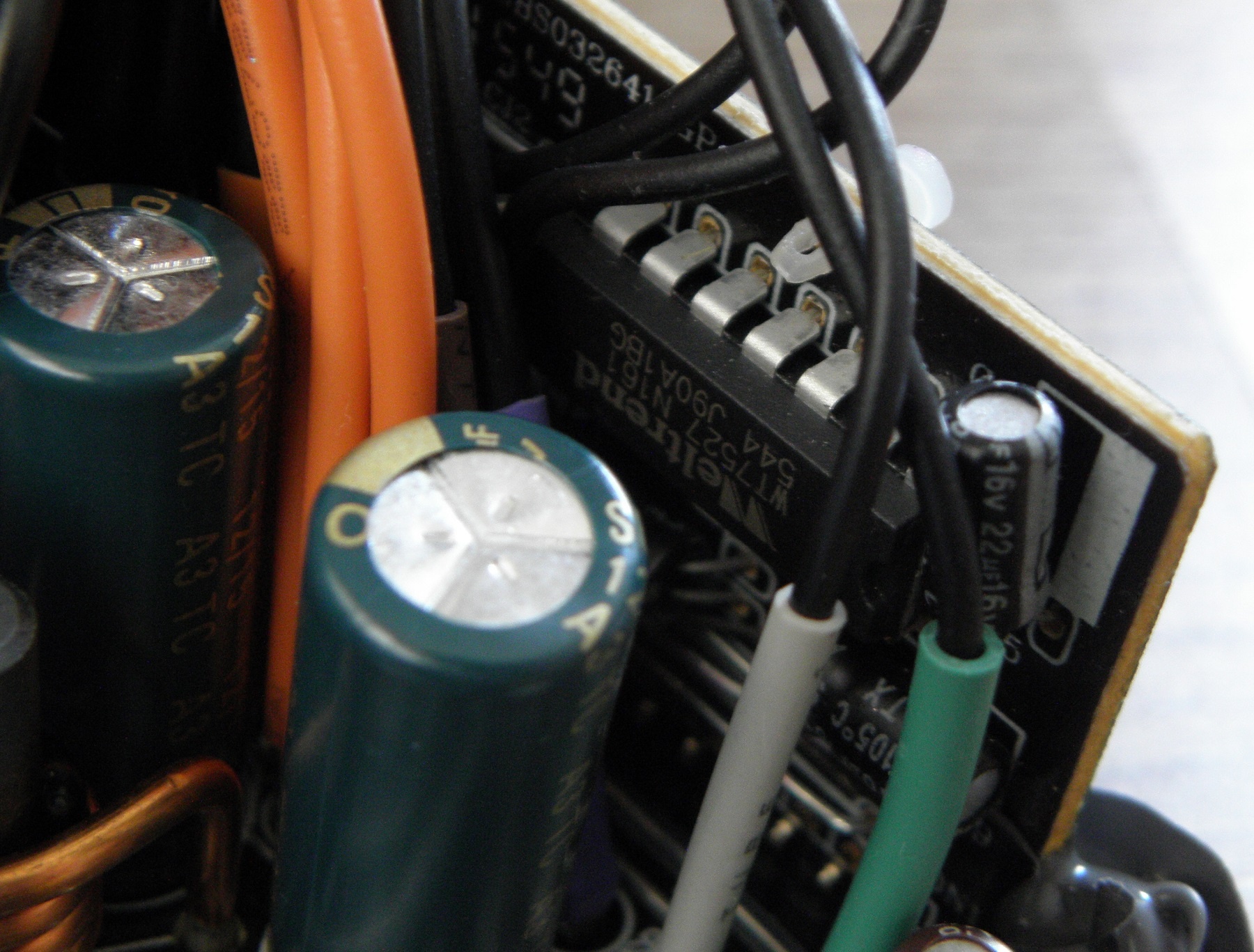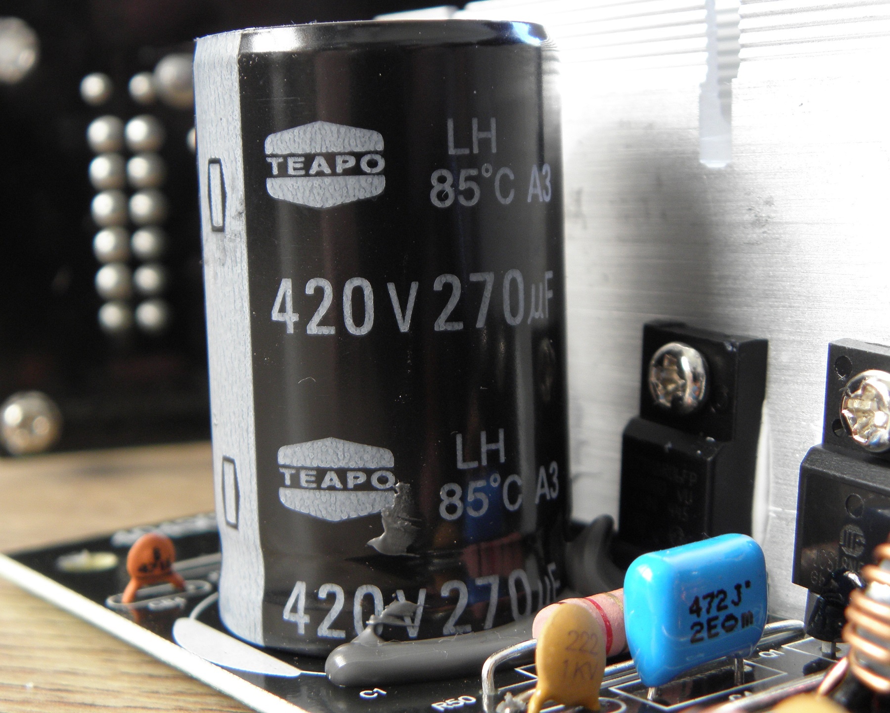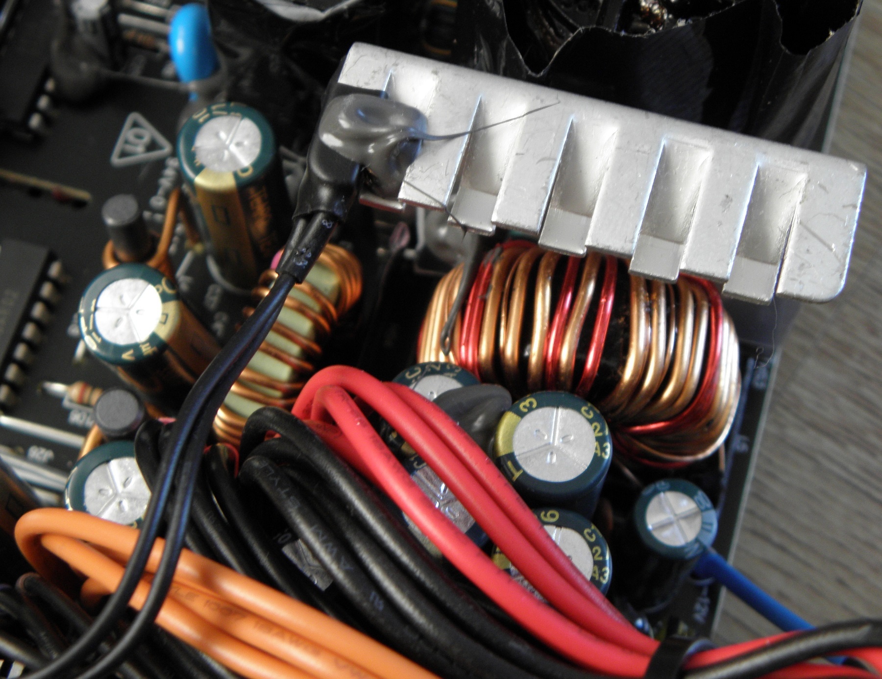 DE FAN De fan van de voeding is een belangrijk onderdeel. Zo moet de fan genoeg airflow bieden om de voeding koel te houden. Als de voeding namelijk te warm wordt kan dit negatieve gevolgen hebben op de prestatie van de voeding. En als er een onderdeel echt veel te warm wordt kan die zelfs stuk gaan, waarbij het mogelijk is dat er schade aan de PC ontstaat. Naast genoeg airflow is de kwaliteit van het lager ook belangrijk, dit bepaalt namelijk hoe lang de fan mee gaat. Een echt goed lager kan tientallen jaren mee, terwijl een slecht lager al na een paar jaar versleten kan zijn. Naast dat is er natuurlijk ook het verschil in geluid. Lagers zelf maken geluid, maar ook de fan en het rooster kunnen door luchtstromen geluid maken. ![]() De fan in de voeding is een be quiet! BQ QF1-12025-MS sleeve bearing fan. Het nadeel van dit type lager is dat de verwachte levensduur het kortst is van alle types die in computerventilatoren aan zult treffen. Stil is de ventilator echter wel en met een maximale snelheid van 1600 RPM kan die ook zelfs in de meest zware omstandigheden niet extreem veel geluid produceren. De 1600 RPM wordt overigens niet behaald bij volledige belasting van de voeding mits de omgevingstemperatuur niet extreem hoog is. TOTAALBEELD INTERN Als eerste een plaatje van hoe de voeding er van binnen uitziet. Bij het openen van de voeding verlies je overigens de garantie, je hebt er daarnaast vaak ook niks aan en open de voeding ook zeker niet terwijl de stekker nog in het stopcontact zit! ![]() ![]() Deze voeding wordt door FSP geproduceerd en is gebaseerd op het Raider platform van FSP. Raider is een cost down versie van Aurum S welke een 80PLUS Gold certificaat heeft. De gehele be quiet! Pure Power 9 CM serie maakt overigens gebruik van dit platform, de gehele niet modulaire Pure Power 9 serie overigens niet, de 300W en 350W versies zijn namelijk andere voedingen. FSP Raider en ook Aurum S kenmerkt zich door het hoge rendement bij lage belastingen, maar ook door de extreem slechte spanningsregulatie, deze voeding is helaas geen uitzondering zoals later in deze review zal blijken. De voeding maakt gebruik van Active Clamp Reset Forward design aan de primaire kant van de voeding. FSP gebruikt dit platform veel in hun voedingen doordat voedingen hierop gebaseerd vrij goedkoop zijn te maken en toch een hoog rendement kunnen leveren. Qua prestaties zal een Active Clamp Reset Forward voeding echter nooit het beste jongetje van de klas zijn, maar voor een voeding in een lagere prijscategorie is dit ook geen probleem. Aan de secondaire kant van de voeding wordt gebruik gemaakt van Synchrone Rectificatie, maar DC-DC heeft de voeding echter niet. De 12V en 5V zijn dan ook nog eens niet individueel van elkaar gereguleerd wat er voor zorgt dat de spanningsstabiliteit zwaar tegenvalt. Om het een interessante voeding te maken hadden ze minimaal er voor moeten zorgen dat de spanningen individueel gereguleerd konden worden zodat de spanningsstabiliteit niet zo te wensen overlaat als nu het geval is. EMI FILTER De voeding begint altijd met een EMI filter. Dit is een belangrijk filter, het filtert namelijk storing die van buitenaf de voeding in wil komen weg. Maar het werkt ook andersom, eventuele storing die de voeding afgeeft wordt ook weggefilterd door het EMI filter. Bij goedkope voedingen wil hier nogal eens op bespaart worden, door het weglaten van enkele componenten. Een enkele keer, bij de meest grote wanproducten, wordt het EMI filter helemaal weggelaten, i.p.v. dat er een aantal componenten missen. Zoals je wel kan bedenken is dat erg onverstandig, aangezien het van allerhande storing en problemen kan veroorzaken en daarnaast is het ook gewoon onveilig. ![]() Het EMI filter begint zoals wel vaker met twee Y-condensators over de fase en ground en nul en ground staan. ![]() ![]() Vanaf de dubbelpolige schakelaar gaan de fase en nul door een ferrietring, na de ferrietring worden de fase en nul aan het PCB gesoldeerd. Vanaf daar bevindt de zekering zich als eerste op het PCB. Dit is een in tegenstelling tot wat je normaal zou zien geen glaszekering maar een kleine zwarte plastic blokje, zichtbaar rechts op de foto's hierboven. Naast de zekering zit een gele X-condensators, daarnaast een common mode smoorspoel, een kleinere X-condensator, twee blauwe Y-condensators, ringkern spoel en nog een common mode smoorspoel. Als beveiliging tegen spanningspieken wordt geen MOV gebruikt maar een gasontladingsbuis (Gas Discharge Tube) van Mitsubishi gehuld in krimpkous. Deze gasontladingsbuis is zichtbaar voor de laatste common mode smoorspoel, de meest linker. Daarmee is het EMI filter compleet, maar worden er wel andere componenten gebruikt voor de overspanningsbeveiliging en zekering dan gebruikelijk. PFC CIRCUIT Van het EMI filter gaan we naar het PFC. Het PFC circuit behoort net als het EMI filter tot de primaire kant van de voeding. Hier wordt de frequentie verhoogt tot de meest ideale waarde voor de transformator. Ook wordt er voor gezorgd dat de stroom en spanning zoveel mogelijk in fase lopen en dit alles met zo weinig mogelijk verlies om zo een relatief hoog rendement te kunnen halen. ![]() De bruggelijkrichter, ook wel diodebrug genoemd, zorgt er voor dat de wisselspanning wordt omgezet naar een pulserende gelijkspanning. De spanning wordt niet meer negatief, maar gaat steeds van de maximale waarde naar 0V zonder negatief te worden. Het precieze type is echter niet zichtbaar doordat de tekst aan de kant zit van de heat sink. ![]() Op bovenstaande foto zie je de APFC spoel welke omhult is door metaal welke storingen tegen moet gaan en daaromheen een laagje zwarte tape ter isolatie. Voor de spoel is nog een condensator zichtbaar en links daarvan zie je een relatief grootte weerstand. ![]() De primaire condensator, ook wel hold-up condensator genoemd, is een Teapo uit de LH serie met een capaciteit van 270μF, een maximale spanning van 420V en een maximale temperatuurrating van 85℃. Met een verwachte