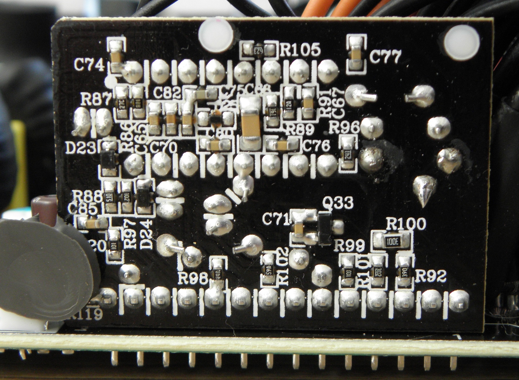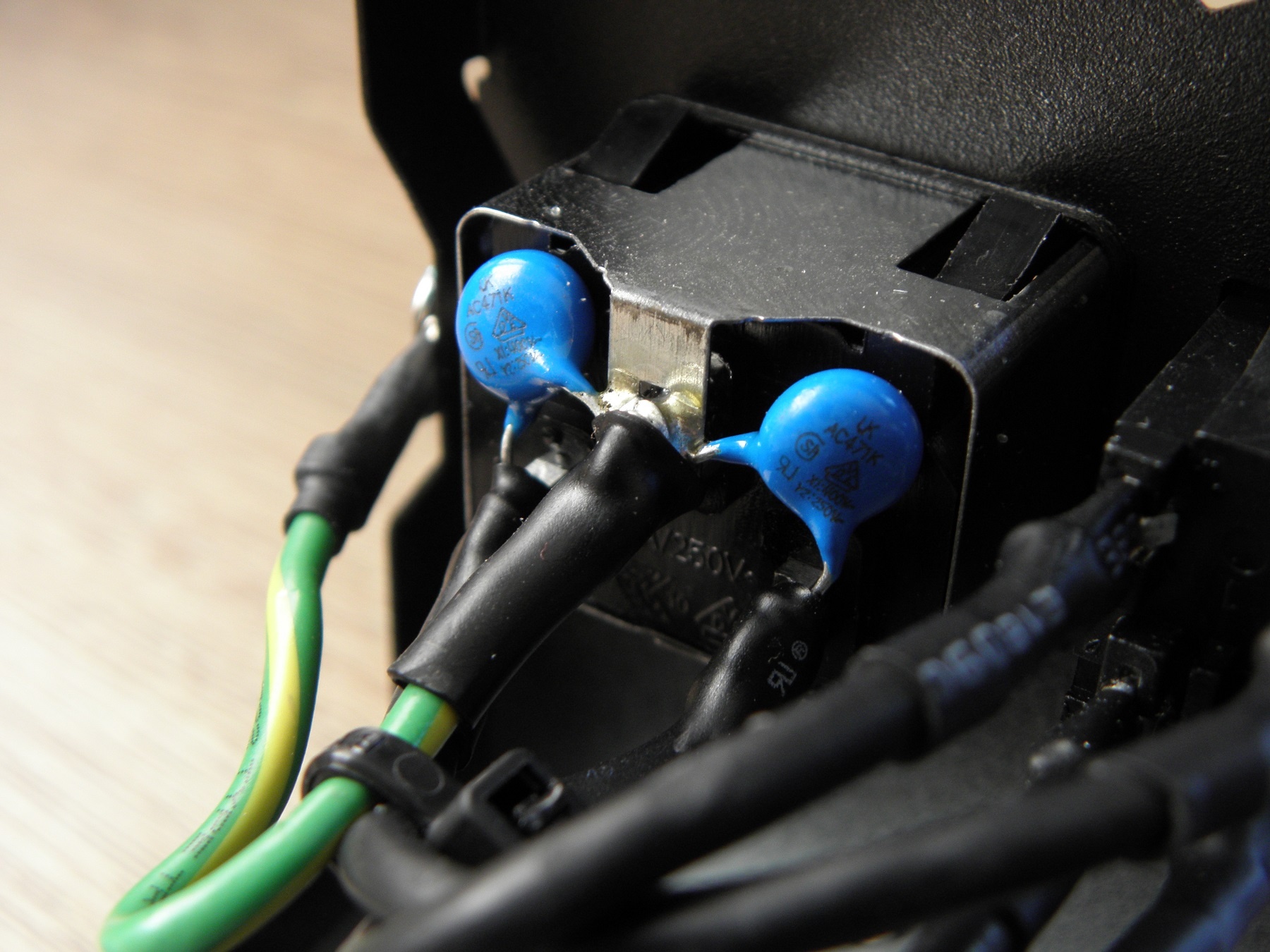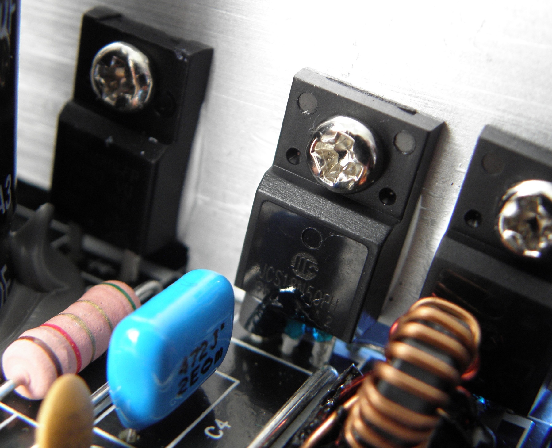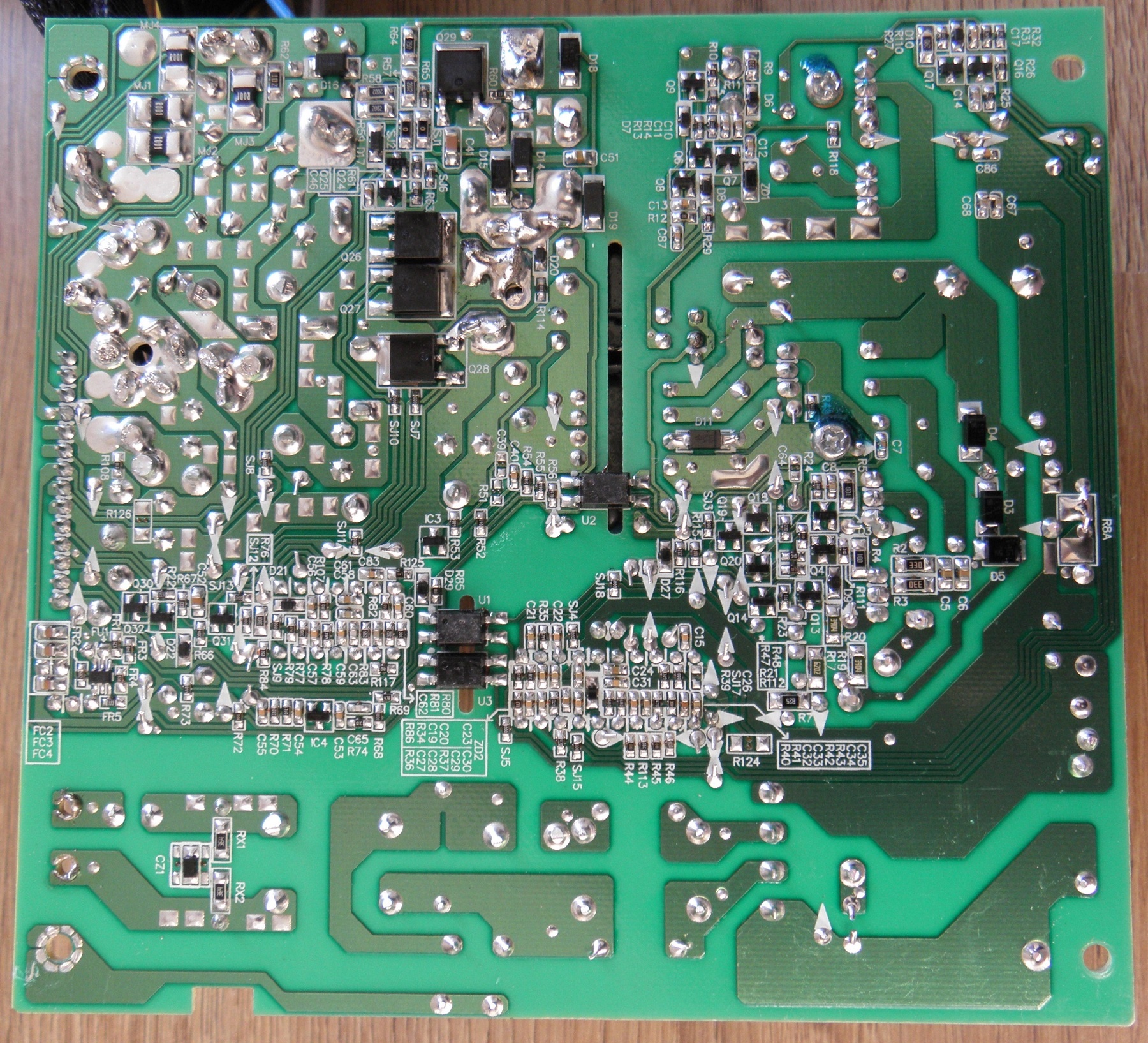 DE FAN De fan van de voeding is een belangrijk onderdeel. Zo moet de fan genoeg airflow bieden om de voeding koel te houden. Als de voeding namelijk te warm wordt kan dit negatieve gevolgen hebben op de prestatie van de voeding. En als er een onderdeel echt veel te warm wordt kan die zelfs stuk gaan, waarbij het mogelijk is dat er schade aan de PC ontstaat. Naast genoeg airflow is de kwaliteit van het lager ook belangrijk, dit bepaalt namelijk hoe lang de fan mee gaat. Een echt goed lager kan tientallen jaren mee, terwijl een slecht lager al na een paar jaar versleten kan zijn. Naast dat is er natuurlijk ook het verschil in geluid. Lagers zelf maken geluid, maar ook de fan en het rooster kunnen door luchtstromen geluid maken. ![]() De fan in de voeding is een be quiet! BQ QF1-12025-MS sleeve bearing fan. Het nadeel van dit type lager is dat de verwachte levensduur het kortst is van alle types die in computerventilatoren aan zult treffen. Stil is de ventilator echter wel en met een maximale snelheid van 1600 RPM kan die ook zelfs in de meest zware omstandigheden niet extreem veel geluid produceren. De 1600 RPM wordt overigens niet behaald bij volledige belasting van de voeding mits de omgevingstemperatuur niet extreem hoog is. TOTAALBEELD INTERN Als eerste een plaatje van hoe de voeding er van binnen uitziet. Bij het openen van de voeding verlies je overigens de garantie, je hebt er daarnaast vaak ook niks aan en open de voeding ook zeker niet terwijl de stekker nog in het stopcontact zit! ![]() ![]() Deze voeding wordt door FSP geproduceerd en is gebaseerd op het Raider platform van FSP. Raider is een cost down versie van Aurum S welke een 80PLUS Gold certificaat heeft. De gehele be quiet! Pure Power 9 CM serie maakt overigens gebruik van dit platform, de gehele niet modulaire Pure Power 9 serie overigens niet, de 300W en 350W versies zijn namelijk andere voedingen. FSP Raider en ook Aurum S kenmerkt zich door het hoge rendement bij lage belastingen, maar ook door de extreem slechte spanningsregulatie, deze voeding is helaas geen uitzondering zoals later in deze review zal blijken. De voeding maakt gebruik van Active Clamp Reset Forward design aan de primaire kant van de voeding. FSP gebruikt dit platform veel in hun voedingen doordat voedingen hierop gebaseerd vrij goedkoop zijn te maken en toch een hoog rendement kunnen leveren. Qua prestaties zal een Active Clamp Reset Forward voeding echter nooit het beste jongetje van de klas zijn, maar voor een voeding in een lagere prijscategorie is dit ook geen probleem. Aan de secondaire kant van de voeding wordt gebruik gemaakt van Synchrone Rectificatie, maar DC-DC heeft de voeding echter niet. De 12V en 5V zijn dan ook nog eens niet individueel van elkaar gereguleerd wat er voor zorgt dat de spanningsstabiliteit zwaar tegenvalt. Om het een interessante voeding te maken hadden ze minimaal er voor moeten zorgen dat de spanningen individueel gereguleerd konden worden zodat de spanningsstabiliteit niet zo te wensen overlaat als nu het geval is. EMI FILTER De voeding begint altijd met een EMI filter. Dit is een belangrijk filter, het filtert namelijk storing die van buitenaf de voeding in wil komen weg. Maar het werkt ook andersom, eventuele storing die de voeding afgeeft wordt ook weggefilterd door het EMI filter. Bij goedkope voedingen wil hier nogal eens op bespaart worden, door het weglaten van enkele componenten. Een enkele keer, bij de meest grote wanproducten, wordt het EMI filter helemaal weggelaten, i.p.v. dat er een aantal componenten missen. Zoals je wel kan bedenken is dat erg onverstandig, aangezien het van allerhande storing en problemen kan veroorzaken en daarnaast is het ook gewoon onveilig. ![]() Het EMI filter begint zoals wel vaker met twee Y-condensators over de fase en ground en nul en ground staan. ![]() ![]() Vanaf de dubbelpolige schakelaar gaan de fase en nul door een ferrietring, na de ferrietring worden de fase en nul aan het PCB gesoldeerd. Vanaf daar bevindt de zekering zich als eerste op het PCB. Dit is een in tegenstelling tot wat je normaal zou zien geen glaszekering maar een kleine zwarte plastic blokje, zichtbaar rechts op de foto's hierboven. Naast de zekering zit een gele X-condensators, daarnaast een common mode smoorspoel, een kleinere X-condensator, twee blauwe Y-condensators, ringkern spoel en nog een common mode smoorspoel. Als beveiliging tegen spanningspieken wordt geen MOV gebruikt maar een gasontladingsbuis (Gas Discharge Tube) van Mitsubishi gehuld in krimpkous. Deze gasontladingsbuis is zichtbaar voor de laatste common mode smoorspoel, de meest linker. Daarmee is het EMI filter compleet, maar worden er wel andere componenten gebruikt voor de overspanningsbeveiliging en zekering dan gebruikelijk. PFC CIRCUIT Van het EMI filter gaan we naar het PFC. Het PFC circuit behoort net als het EMI filter tot de primaire kant van de voeding. Hier wordt de frequentie verhoogt tot de meest ideale waarde voor de transformator. Ook wordt er voor gezorgd dat de stroom en spanning zoveel mogelijk in fase lopen en dit alles met zo weinig mogelijk verlies om zo een relatief hoog rendement te kunnen halen. ![]() De bruggelijkrichter, ook wel diodebrug genoemd, zorgt er voor dat de wisselspanning wordt omgezet naar een pulserende gelijkspanning. De spanning wordt niet meer negatief, maar gaat steeds van de maximale waarde naar 0V zonder negatief te worden. Het precieze type is echter niet zichtbaar doordat de tekst aan de kant zit van de heat sink. ![]() Op bovenstaande foto zie je de APFC spoel welke omhult is door metaal welke storingen tegen moet gaan en daaromheen een laagje zwarte tape ter isolatie. Voor de spoel is nog een condensator zichtbaar en links daarvan zie je een relatief grootte weerstand. ![]() De primaire condensator, ook wel hold-up condensator genoemd, is een Teapo uit de LH serie met een capaciteit van 270μF, een maximale spanning van 420V en een maximale temperatuurrating van 85℃. Met een verwachte