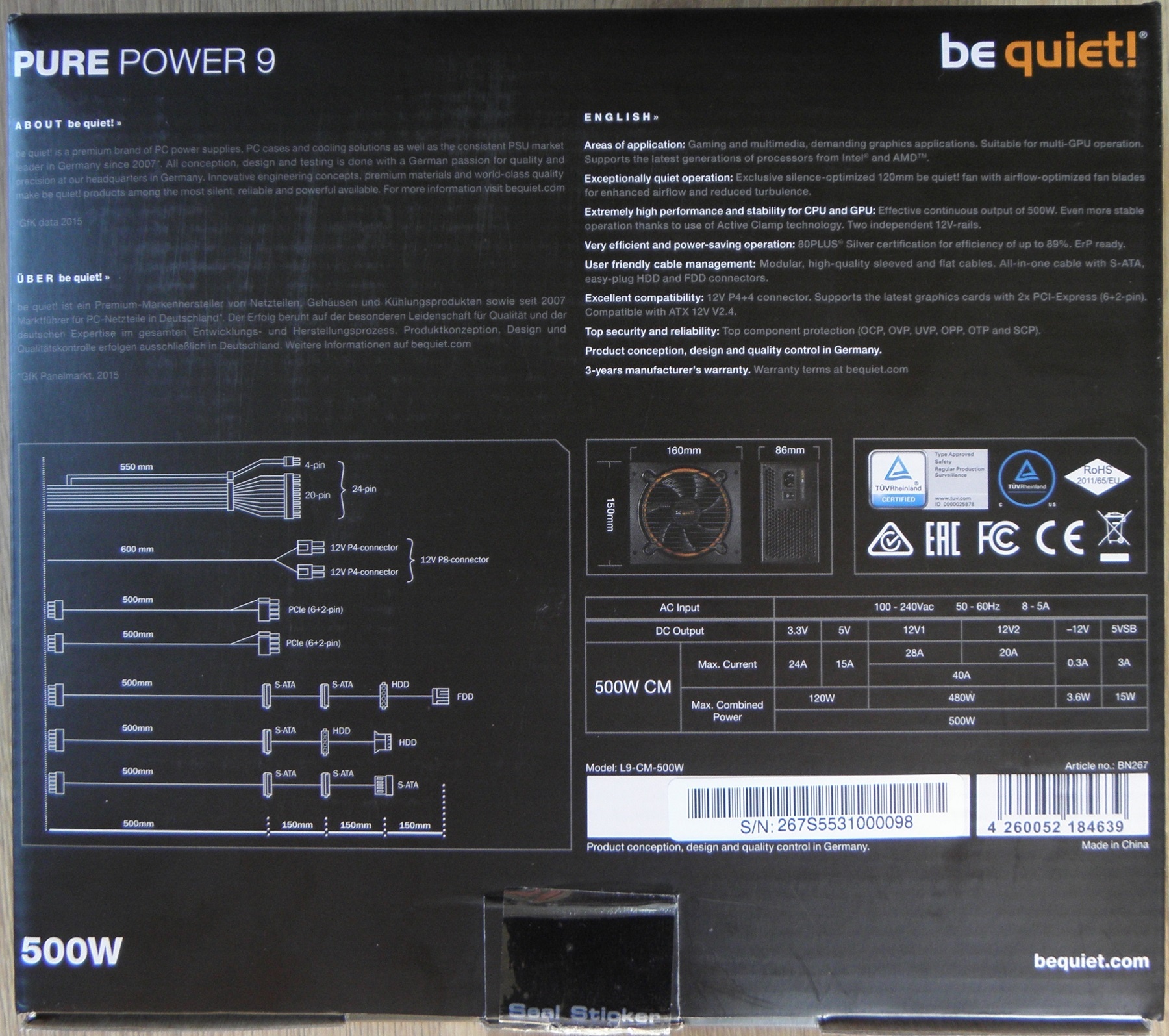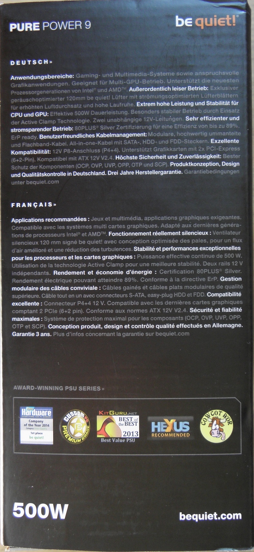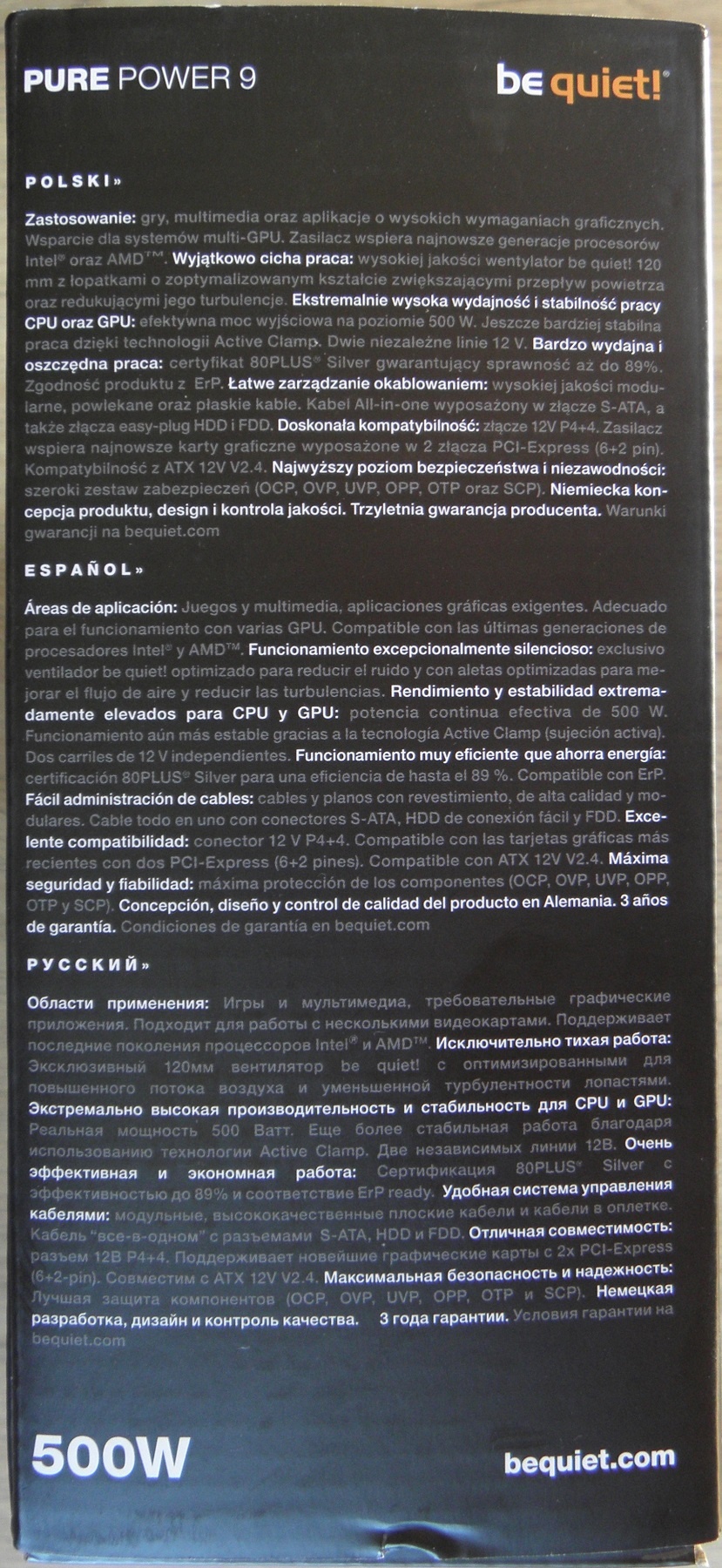 VERPAKKING Een goede verpakking is belangrijk voor een voeding. Sowieso is het natuurlijk handig om wat informatie over de voeding te weten kunnen komen. Maar ook tegen transportschade is een goede verpakking belangrijk, het zou immers zonde zijn dat de voeding bij aankomst al kapot is. ![]() Op de voorkant van de verpakking zie je een afbeelding van de voeding met daarbij de belangrijkste kenmerken van het product. Zo zie je bovenaan het 80PLUS Silver logo en daarnaast staat cable management, of te wel afneembare kabels (modulair). De voeding zou daarnaast uiterst stil moeten zijn en heel erg betrouwbaar, in de review zullen we wel zien hoe correct dat is. Ook wordt er gesproken over een rendement tot 89% en zou de voeding de ondersteuning moeten hebben voor meerdere videokaarten. Wat in principe klopt, maar dan zal het wel moeten gaan over budget en mainstream videokaarten, high-end videokaarten zullen normaal gesproken te veel verbruiken. Als laatste wordt de 3 jaar garantie nog vermeld, wat tegenwoordig vrij kort is voor een product in deze prijscategorie. ![]() Op de achterkant van de verpakking kun je vrij veel informatie vinden. Zo vind je iets over be quiet!, de kabels, connectors, railverdeling, afmetingen en veiligheidscertificaten. Ook nog een stukje over de belangrijkste kenmerken van de voeding met wat meer uitleg daarbij. ![]() ![]() De boven en onderkant van de verpakking geeft je weinig informatie boven dat je weet welke voeding je hebt. ![]() ![]() De belangrijkste kenmerken die op de achterkant van de voeding stonden vindt je ook terug op de beide zijkanten van de voeding in andere talen dan het Engels, het Nederlands staat er echter niet tussen. VERPAKKINGSMATERIAAL In de verpakking zelf vind je natuurlijk de voeding en zoals gezegd is goed verpakkingsmateriaal belangrijk tijdens transport. Voordat de voeding bij jou op de deurmat ligt is die immers de halve wereld rond geweest. ] ![]() Bij het openen van de verpakking zie je de handleiding op een stuk karton waaronder de voeding ligt. Daarboven zijn de modulaire kabels en AC kabel zichtbaar. ![]() Als je het stukje karton verwijderd zie je dat de voeding daaronder zit verpakt in bubbeltjesplastic. Dit is vanzelfsprekend niet de beste manier van verpakken. De voeding verpakt in plastic met daaromheen schuimrubber zou de voeding een stuk beter beschermen tegen krassen en heftige bewegingen. ACCESSOIRES Het minimale wat je verwacht bij een voeding te krijgen is een AC powerkabel, vier schroefjes en een simpele handleiding. Daarnaast zitten er vaak ook nog wel wat tie-wraps bij en bij luxere voedingen soms ook nog wat extra's. ![]() Bij de voeding wordt een plastic zakje geleverd met daarin vijf kleine tie-wraps voor het betere kabel management en vijf boutjes (één reserve) voor het bevestigen van de voeding in de behuizing. Ook zit er vanzelfsprekend een AC kabel bij om de voeding aan te sluiten. En een handleiding ontbreekt ook niet, een relatief uitgebreide handleiding is het zelfs. De handleiding is hier te bekijken. |