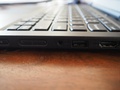 Dit is de linker kant van de laptop. Hier zitten de adapter aansluiting, de LAN aansluiting en een USB aansluiting. Ook is hier de sd-card reader.