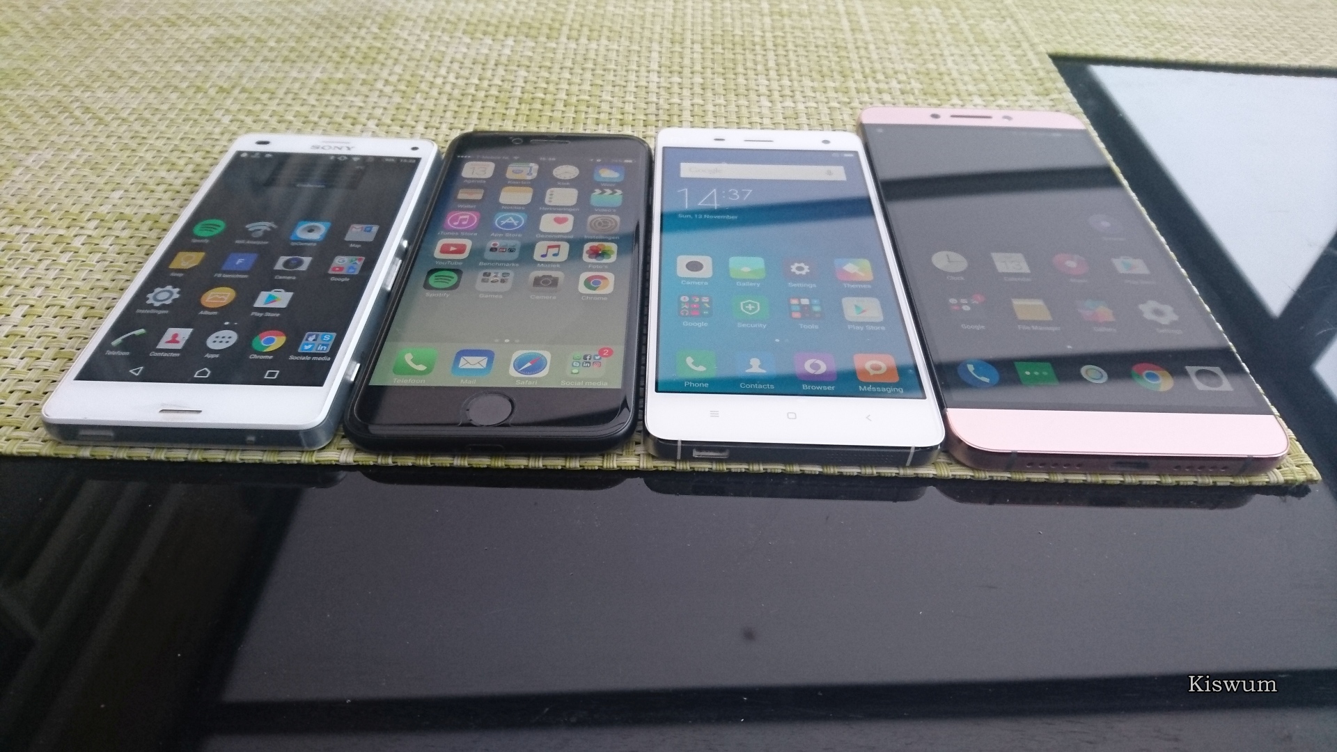 Vergelijking van het formaat met de 4,6" Sony Xperia Z3 compact, 5" Xiaomi Mi4 en de 5,5" LeEco Le Max2:
