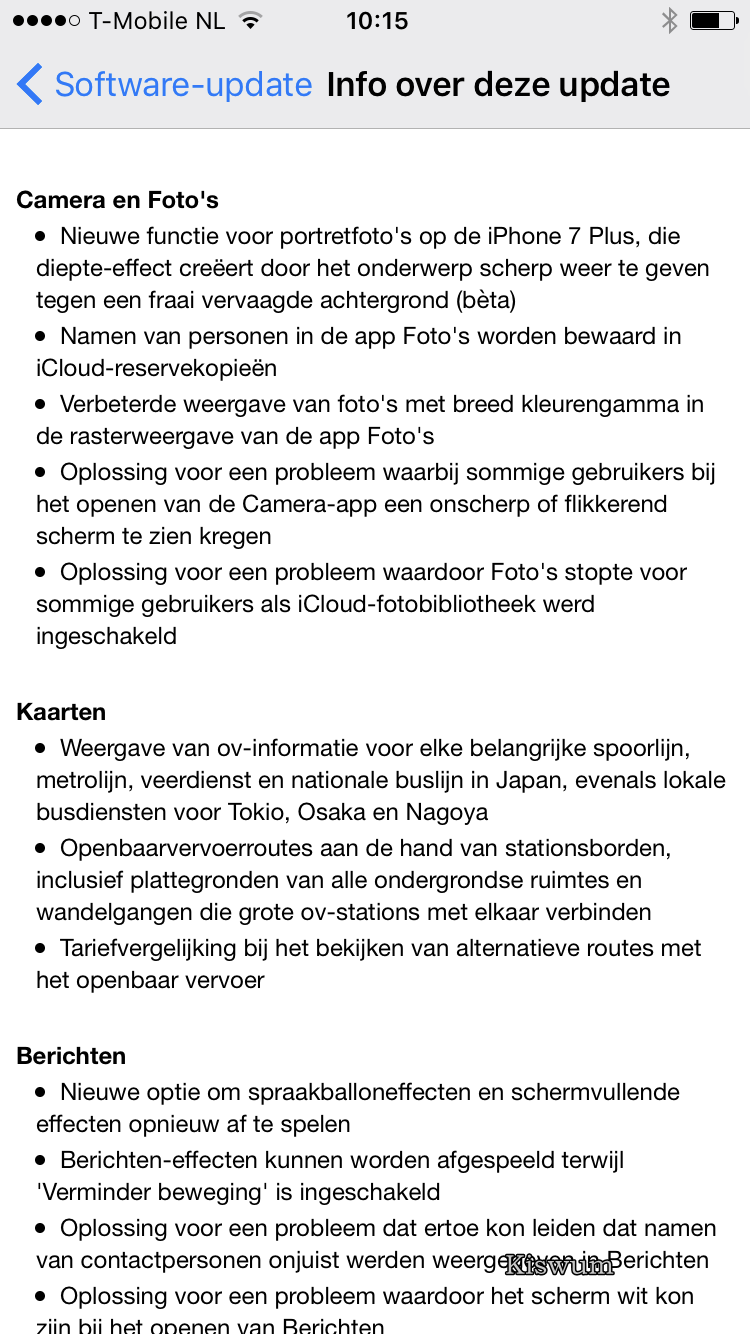 De nieuwste software zal automatisch via OTA (Over-The-Air) naar de telefoon worden gestuurd. Daardoor heb je er zelf weinig tot geen omkijken naar. Het enige dat je moet doen, is de update downloaden en installeren. Enkele dagen voordat deze review online kwam, is iOS 10.2 uitgerold en geïnstalleerd. De review is daar niet op gebaseerd, maar tot nu toe merk ik nog geen voor- of nadelen.
