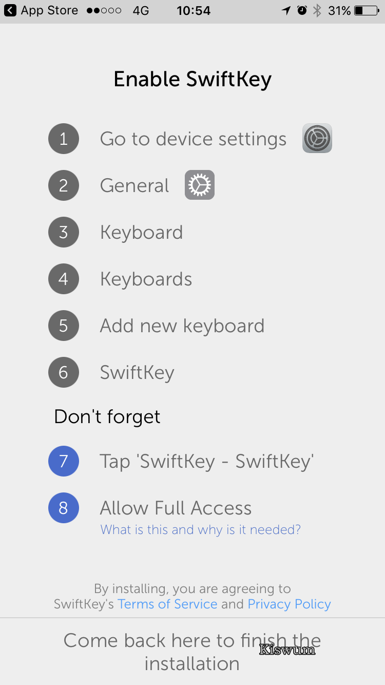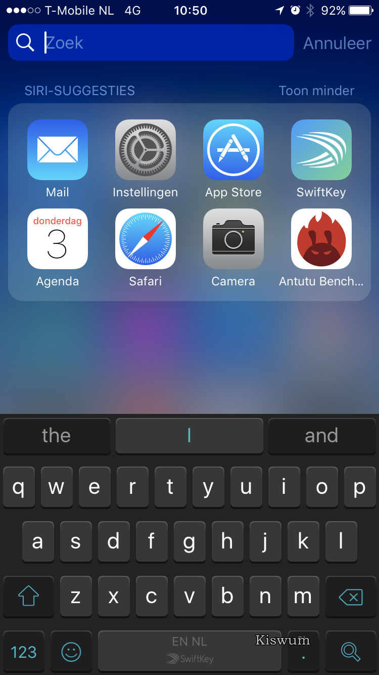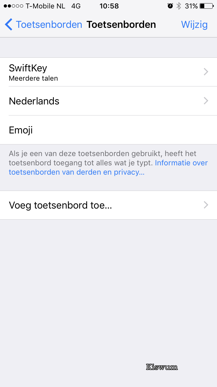 Het standaard toetsenbord vind ik niet prettig. Ik mis een veeg/swype mogelijkheid. Deze feature is ongeveer 5 jaar standaard beschikbaar op Android telefoons. Om alsnog gebruik te maken van die functionaliteit, heb ik SwiftKey geïnstalleerd. Deze werkt prettig en net zo snel als het standaard toetsenbord. Het valt op dat Apple ervoor heeft gekozen om wachtwoorden en pincodes altijd via het eigen toetsenbord in te laten voeren. Veel externe toetsenborden verzamelen namelijk gegevens om bijvoorbeeld formulieren sneller in te laten vullen of om je schrijfstijl aan te leren. Deze gegevens worden ergens bewaard en dat is niet altijd op de telefoon. Om ervoor te zorgen dat je wachtwoorden niet in verkeerde handen vallen, schakelt iOS automatisch terug naar het originele toetsenbord op het moment dat je een wachtwoord/pincode in moet vullen.