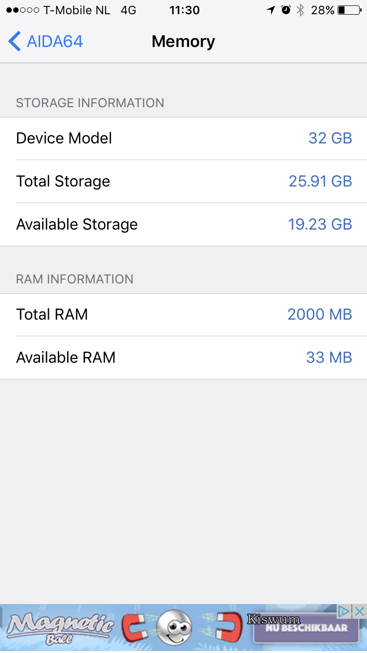 Van de aangegeven 2GB werkgeheugen is ongeveer 650MB beschikbaar. Het lijkt erop dat iOS bijna 1,3GB in beslag neemt. In de praktijk houd je slechts 30-100MB over, maar daar zal je geen last van hebben. Op het moment dat meer werkgeheugen nodig is, zal het OS apps op de achtergrond afsluiten.