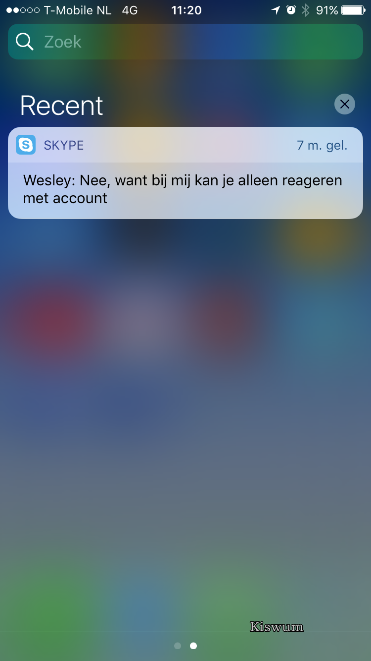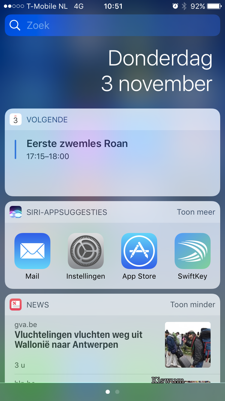 Het notificatie menu kan tevoorschijn worden gehaald, door van boven naar beneden te schuiven. Vanaf het notificatie menu (recente meldingen) kun je naar rechts schuiven om snel de widgets te bekijken. Als je in het hoofdscherm vanaf het midden naar beneden schuift, dan zijn zes Siri-suggesties te zien. Dat zijn apps die onlangs zijn gebruikt. In dat scherm is tevens een zoekveld aanwezig om zoekopdrachten op de telefoon of op het internet uit te voeren.