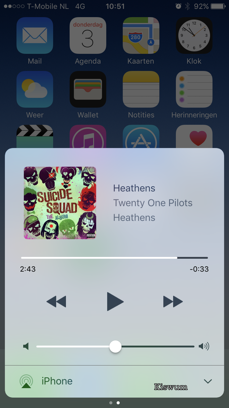 Het notificatie menu is voorzien van maar één tabblad. Hierdoor zijn de notificaties wel zichtbaar, maar snelkoppelingen naar instellingen bijvoorbeeld niet. Deze opties zijn te benaderen door vanaf het hoofdscherm van beneden naar boven te schuiven. Hier zijn onder ander de nachtmodus, helderheid van het scherm, zaklamp en wifi schakeling te vinden. Met een veeg naar links kom je terecht op de muziekspeler.