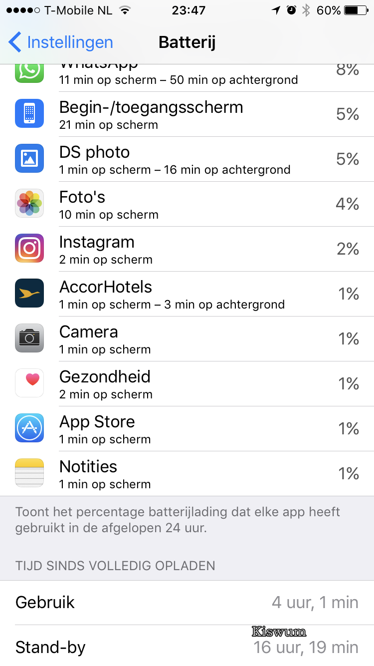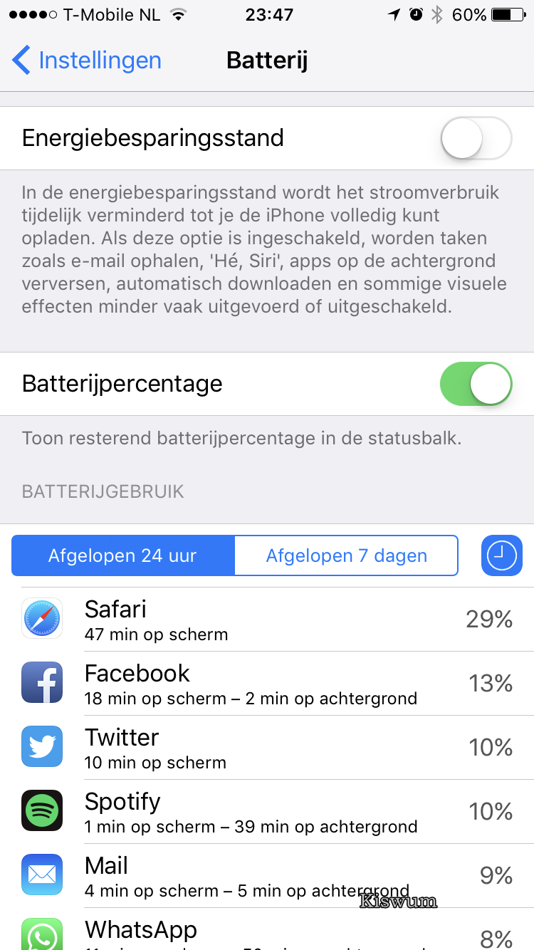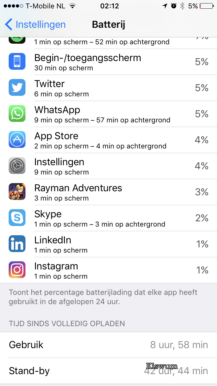 Gebruik van de iPhone 7 stond op dat moment op 8-9 uur (rond 22.00 uur de volgende avond). Uiteraard is dit resultaat niet haalbaar als je dagelijks 1 uur of langer een spel speelt of enkele uren per dag films kijkt op een smartphone.