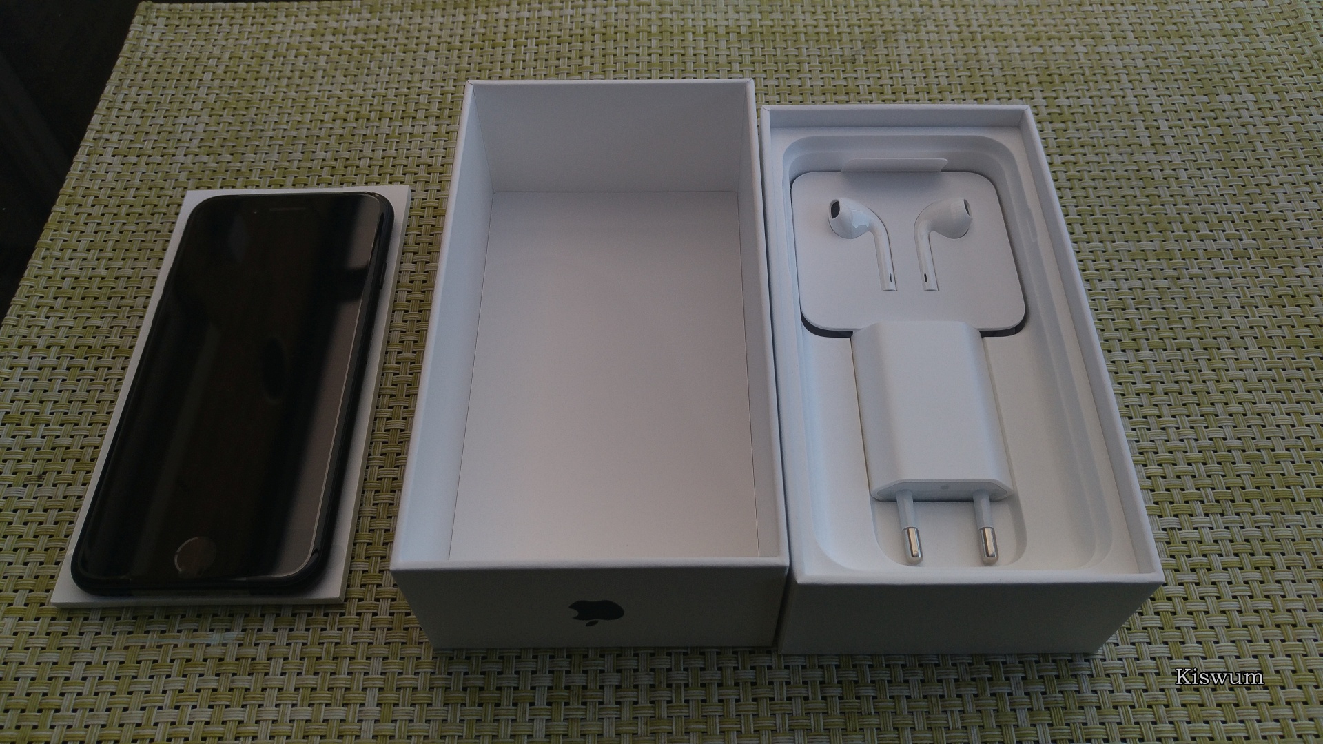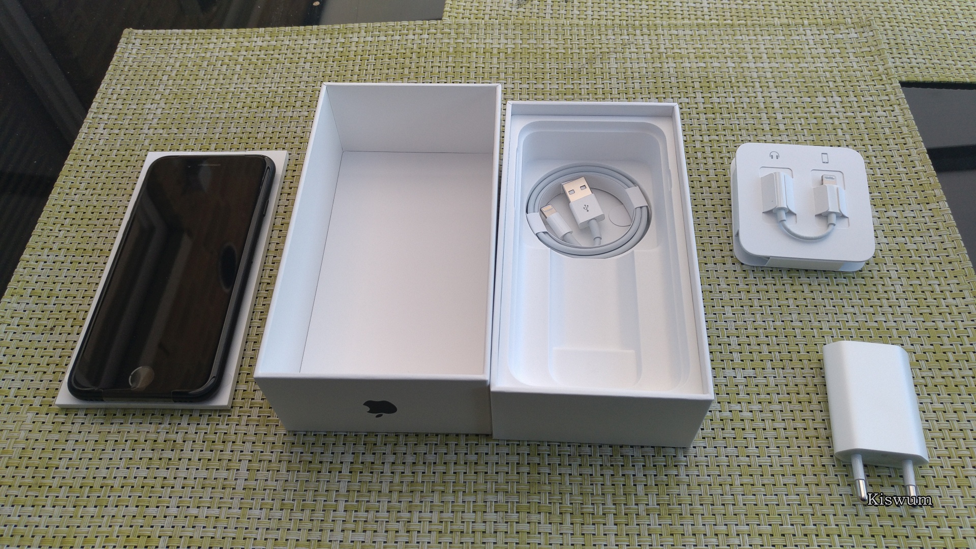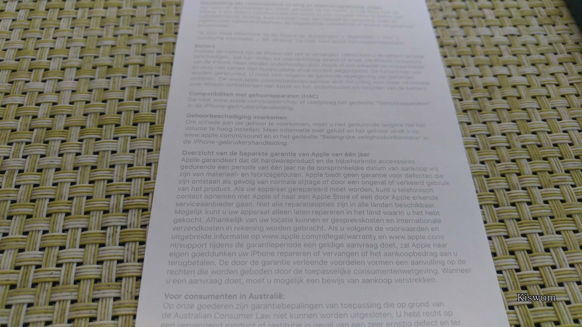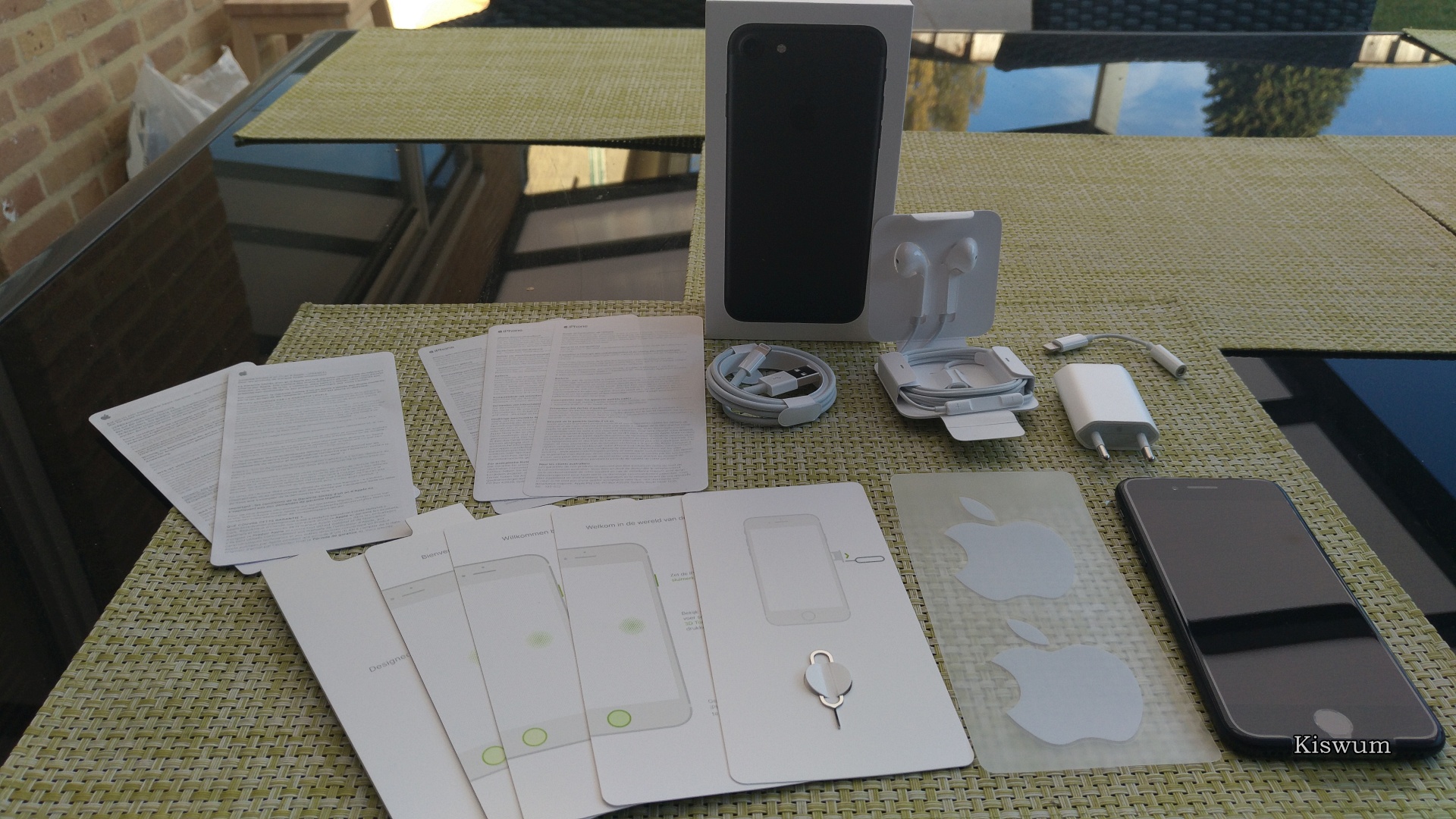 Bij het openen van de doos kom je als eerste een mapje tegen met handleidingen. In dat mapje zitten niet alleen de handleidingen, maar ook de pin voor de sim-tray en twee fraaie stickers met het Apple logo. Onder het mapje is de telefoon te vinden. Direct onder de telefoon liggen de hoofdtelefoon en EU stekker netjes op de eigenaar te wachten. Als de hoofdtelefoon wordt omgedraaid, dan zijn aan de achterkant de lightning naar 3,5mm jack converter vinden. In het laatste vak is de lightning kabel te vinden.