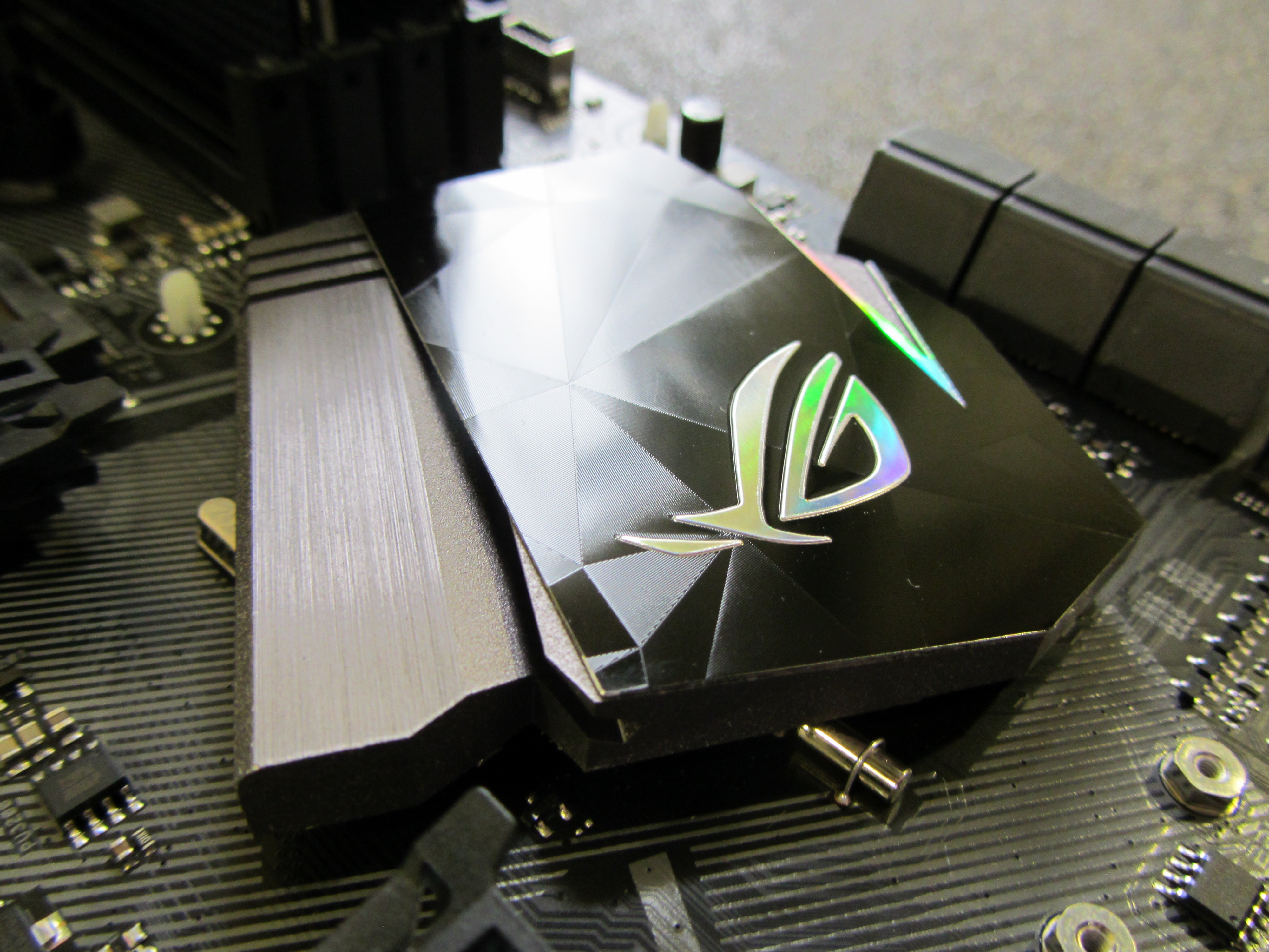 Als we de PCI-e trappen omhoog klikken tot het bovenste slot komen we vlakbij het I/O. Bovenop het I/O vinden we een kap met een ingebouwde AURA-LED, op de heatsink daaronder zit een subtiele gravering van het Strix merk. Gewoon lekker clean.