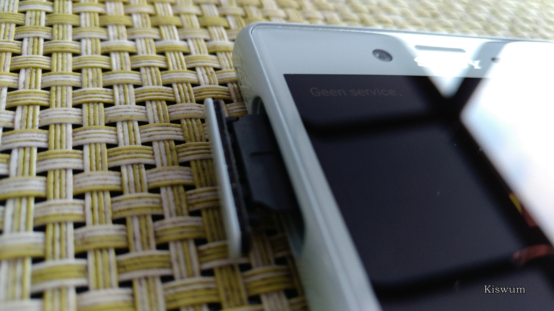 • Aan de linkerkant is een klep te vinden met daar achter een tray voor de nano-simkaart en SD kaart.