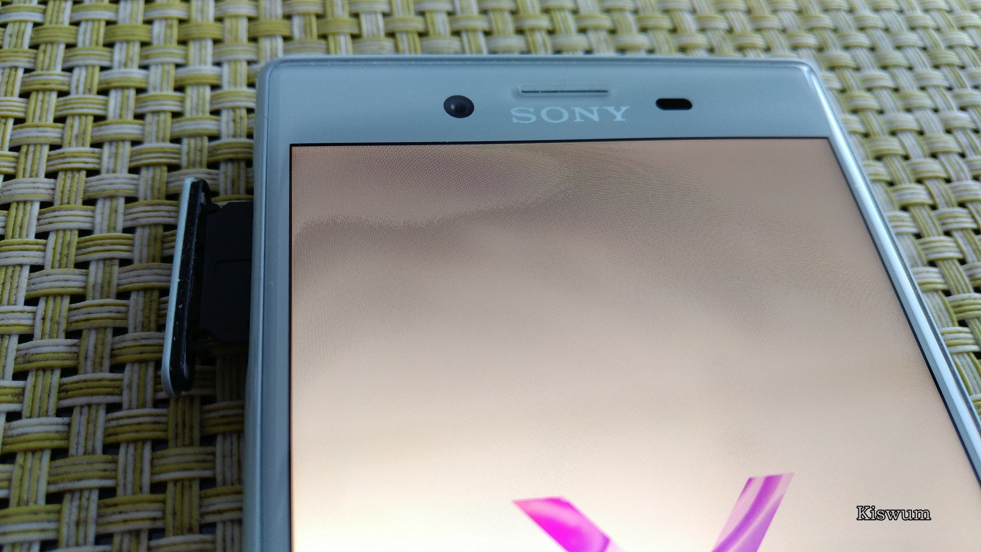 Bovenin het scherm zitten de 5MP camera, (bel)luidspreker, Sony logo, lichtsensor en notificatie LED. Onderaan het scherm is de tweede speaker te vinden, waardoor stereo-geluid mogelijk is. De Xc maakt gebruik van onscreen knoppen in het scherm. Deze virtuele knoppen zijn onder in beeld te vinden. In de huidige versie zijn de knoppen als volgt ingedeeld: van links naar rechts: een driehoekje voor de
