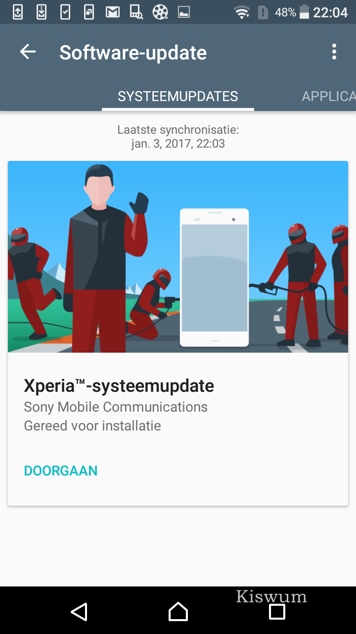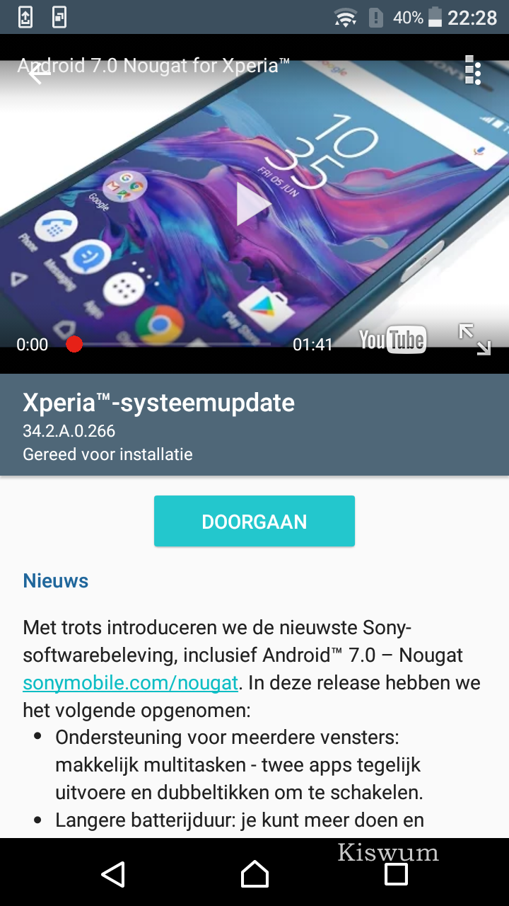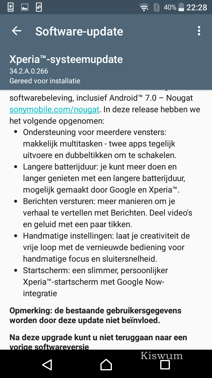 De nieuwste software zal doorgaans via OTA (Over-The-Air) naar de telefoon worden gestuurd. Na de configuratie van het internet op de telefoon, kwamen er 2-3 nieuwe software updates binnen. Je moet eerst een update downloaden om überhaupt te kunnen updaten. Vervolgens krijg je nog 1 update zodat je daarna Android 7.x kunt downloaden. Het is jammer dat het niet allemaal in 1 keer kon, want dit hele proces duurde ongeveer een uur. Dit probleem kwam ik ook tegen bij de Xperia Z5 compact. Gelukkig is dit een proces die je slechts eenmaal hoeft te ondergaan