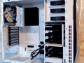 Rechtsonder monteer je natuurlijk je harde schijven. Er zijn twee maal 3 plaatsen voor harde schijven. De ventilator vooraan blaast op de drie onderste harde schijven. De ventilator blaast ook tegen de kast aan en de openingen daar hadden voor mij groter mogen zijn. De plastic montagestukken zijn niet zo stevig. Wel zitten er rubbertjes aan die trillingen kunnen absorberen. Montage van de schijf werkt met een eenvoudig kliksysteem. Dus geen vijsjes nodig. De SATA en voedingsaansluitingen worden naar de rechterkant van de kast gericht. (Dus naar de achterkant van het moederbord.)