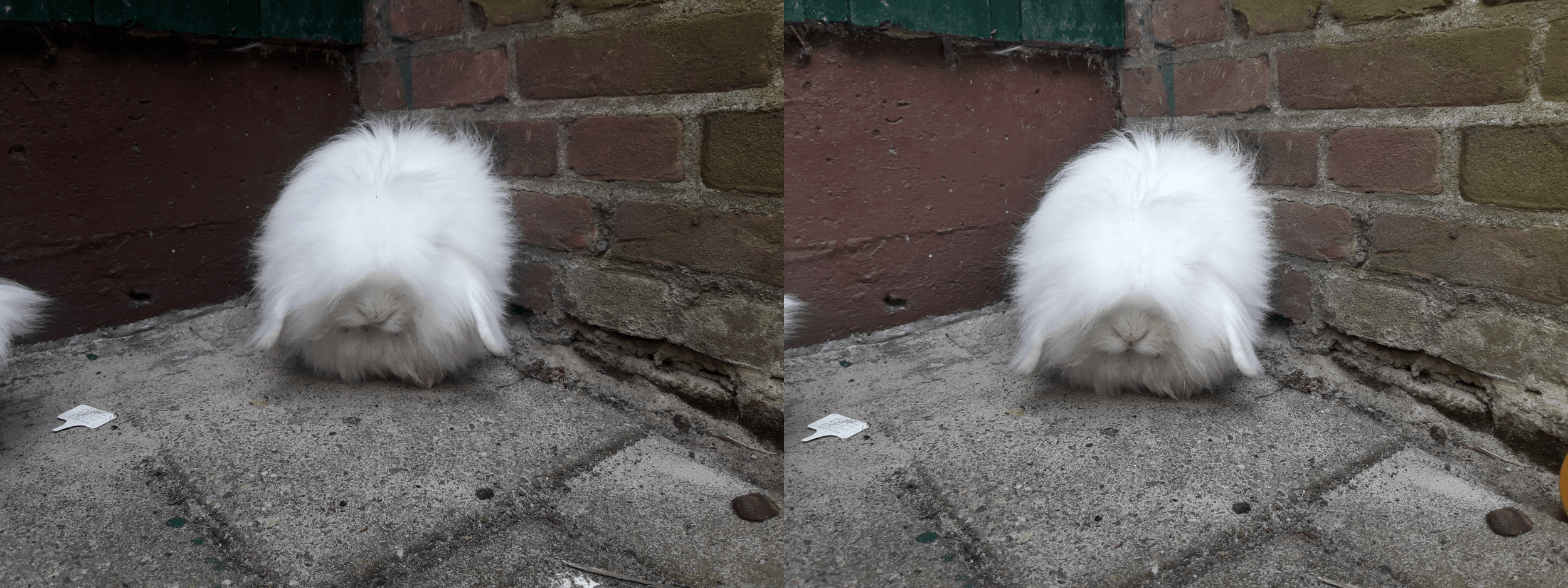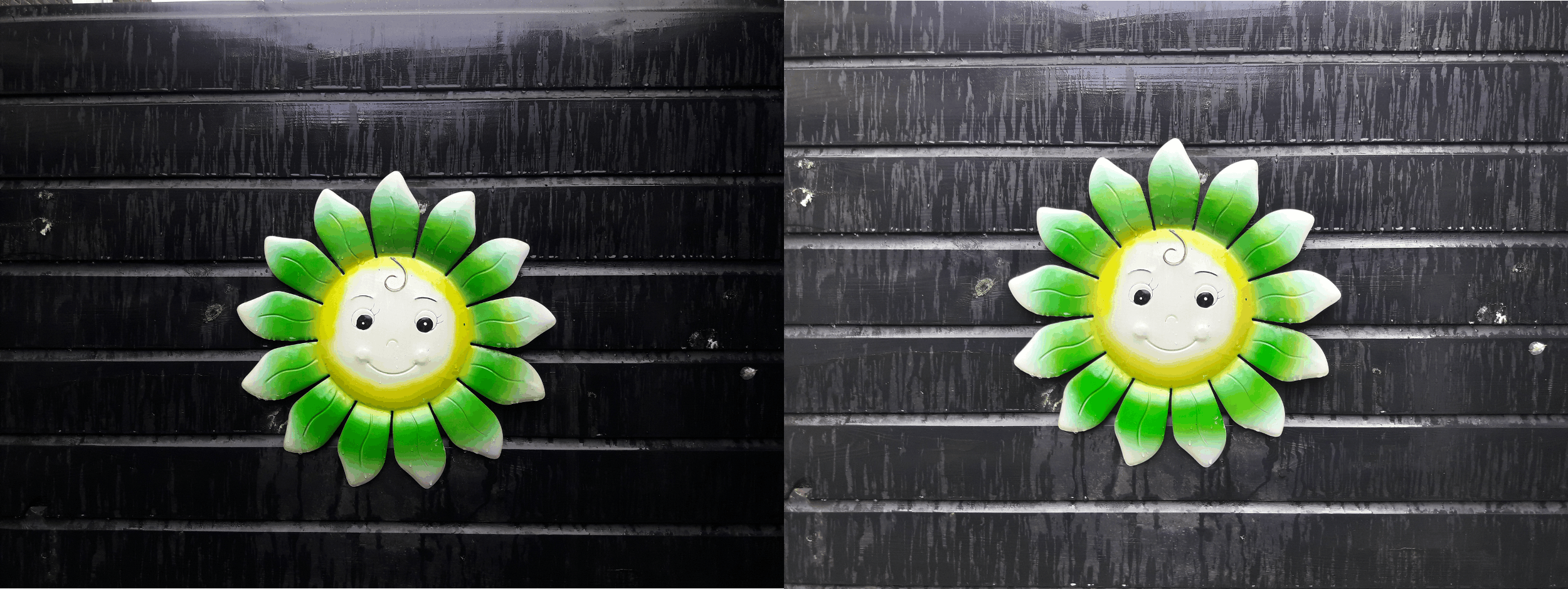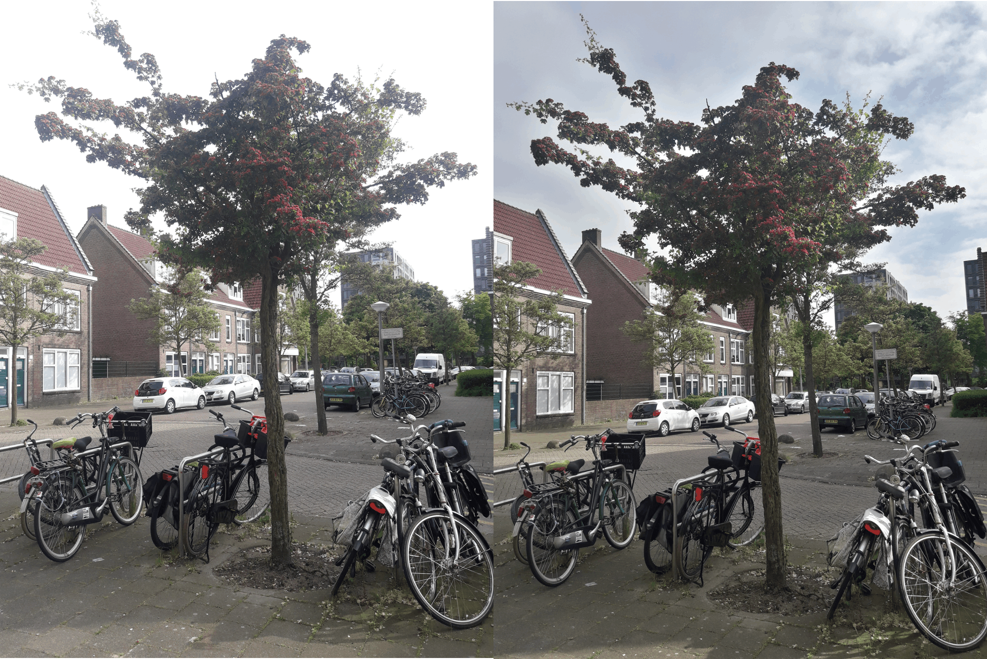Zwarte achtergrond tijdens het regenen; links normaal, rechts HDR.