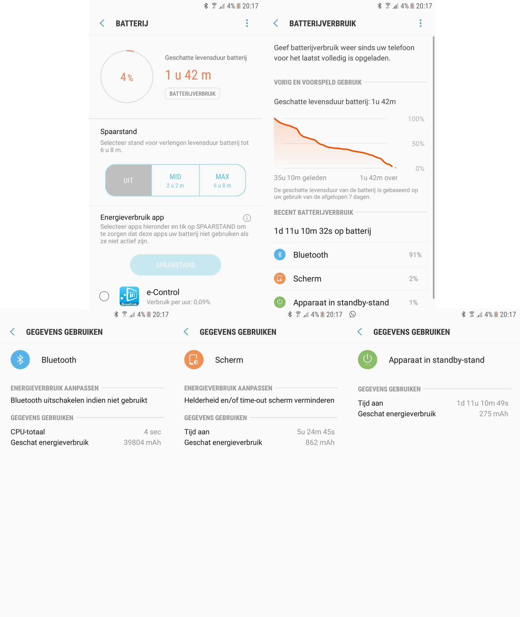 De verwisselbare accu van 2800mAh gaat ongeveer 1.5 dag mee, terwijl ik bijna 5,5 uur de scherm, GPS en Bluetooth aan had.