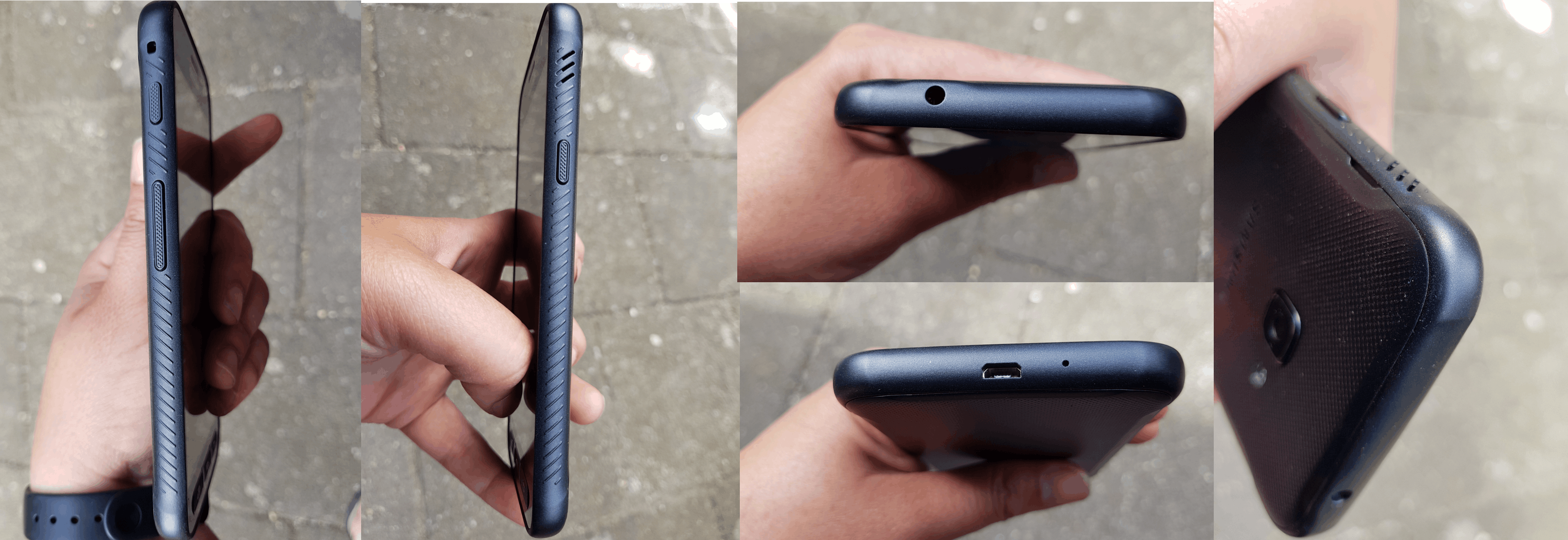 Aan de linker zijkant, zit de Xcover toets, en de volumeknoppen. Rechts zit de powerknop. Bovenop de 3.5 audio uitgang en onderin de micro usb poort en microfoon.