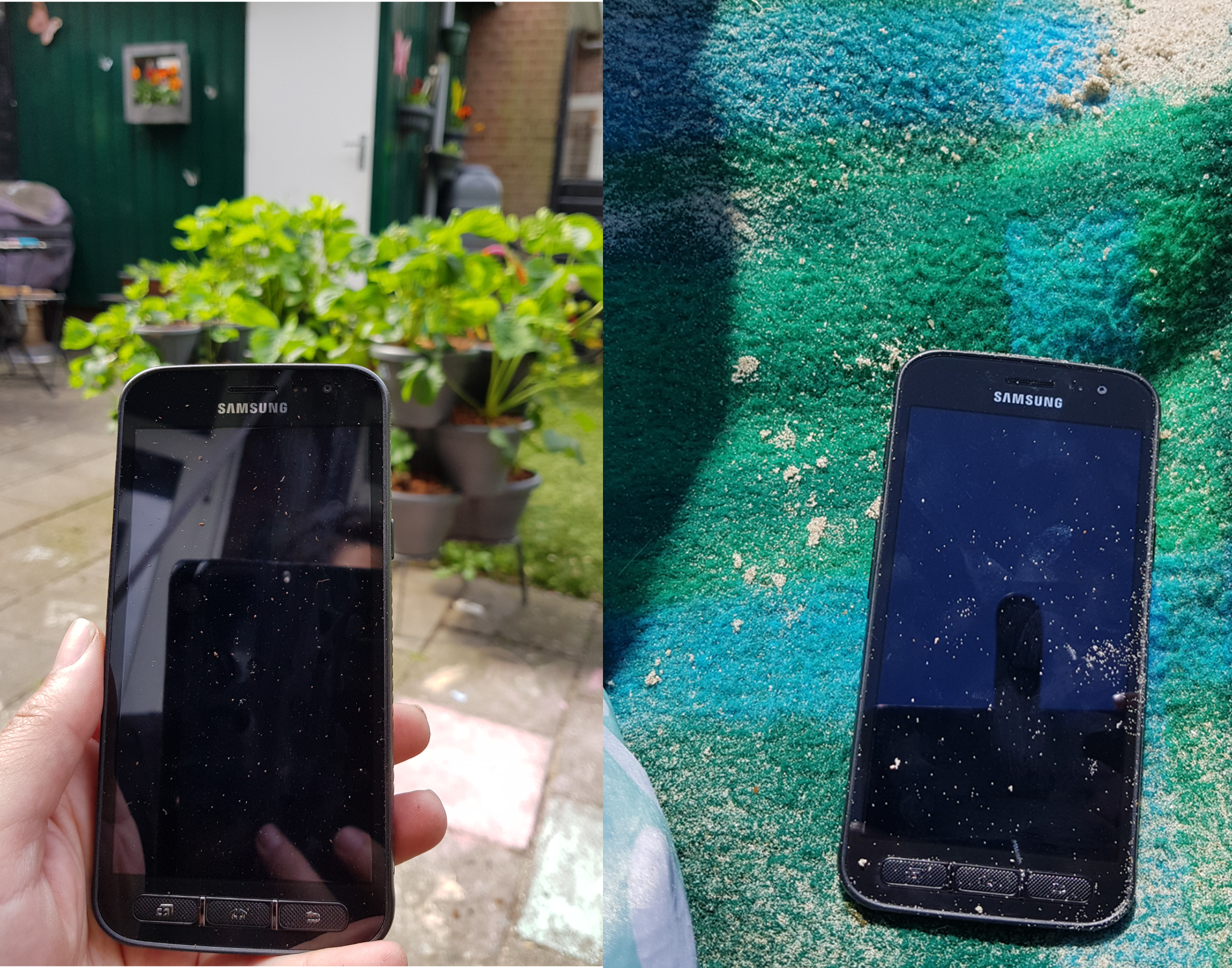 water/stofdichtheid en robuustheid werd getest. Ben gek op tuinieren en alle verdwaalde potgrond kon ik goed afvegen. Dit ook tijdens een weekendje strand. De Xcover lag naast me op het strandlaken en toen zoonlief te fanatiek ging graven, kon ik het zand gewoon afvegen.