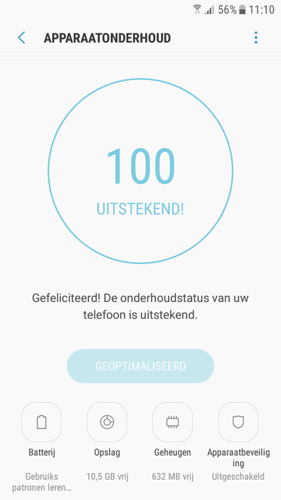 Een schone installatie, zonder aan te melden bij Google en Samsung laat nog 10.5GB over van de 16GB beschikbare opslagruimte.