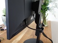 Daarnaast is het scherm ook nog draaibaar (-90 en 90 graden) en kantelbaar (min 5 graden, max 35 graden). Wat opvalt is dat er geen voorkeurspositie is om het scherm horizontaal (met een hoek van 0 graden) te positioneren. Je moet dus op het oog (of naar smaak) het scherm recht zetten. Let er bij het draaien op dat de kabels ver genoeg uit de kabelhouder getrokken zijn! Doordat er niet veel ruimte in de kabelhouder is zitten de kabels er redelijk strak in. Bij het draaien van het scherm zal er dan ook aan flink aan de connectoren getrokken worden wat uiteraard niet goed is voor de kabels. De kleinere kabelklem heeft hier in mindere mate of geen last van, want door de klem worden de kabels zonder veel weerstand heengetrokken.