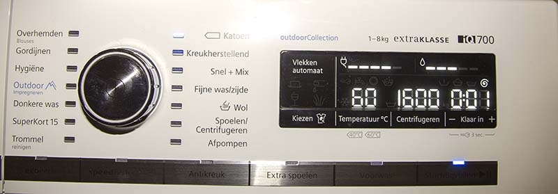 Bij de hoofdprogramma's heb je ook nog eens allerlei extra instellingsmogelijkheden, zoals aanpasbare temperatuur, aanpasbaar toerental voor centrifugeren en instelbare tijd dat het wasgoed klaar moet zijn. De speciale vlekkenprogramma’s voor bijvoorbeeld bloed-, gras-, wijn- en vetvlekken passen de manier van wassen en inweken aan, aan de verschillende soorten vlekken. De tijd die een wasbeurt in beslag neemt, wordt daarmee ook langer, maar het wasresultaat is er dan ook naar. Een katoenen broek waarin een vetvlek zat, die de oude machine er niet meer uit kreeg, kwam na meer dan drie uur brandschoon uit de machine.
