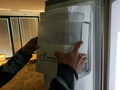 Het glazen paneel is onderdeel van het door-in-door systeem zoals LG het noemt. Wat dit inhoudt is dat de rechtse deur eigenlijk uit twee deuren bestaat. De deur kan in zijn geheel geopend worden, maar ook het rechts bovenste deel van de koelkast is een aparte deur. Dit houdt in dat je, nadat je hebt aangeklopt, alleen het kleine deurtje open hoeft te doen. Dit systeem zou een energiebesparing van meer dan 40% opleveren.