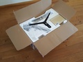 Unboxing maakt tegenwoordig ook onderdeel uit van de aankoop experience Zoals je op de volgende plaatjes kan zien zit hts echerm in een recht-toe-recht-aan doos. Keurig verpakt, maar geen experience. Alles zit ingeklemd in piepschuim de standaard, een afdekplaatje, een doosje met kabels en documentatie en natuurlijk het scherm zelf. Strak en zakelijk, precies zoals voor de doelgroep van dit scherm bedoeld is. Aan de stickers op de doos te zien was dit review exemplaar al de hele wereld over geweest :-)