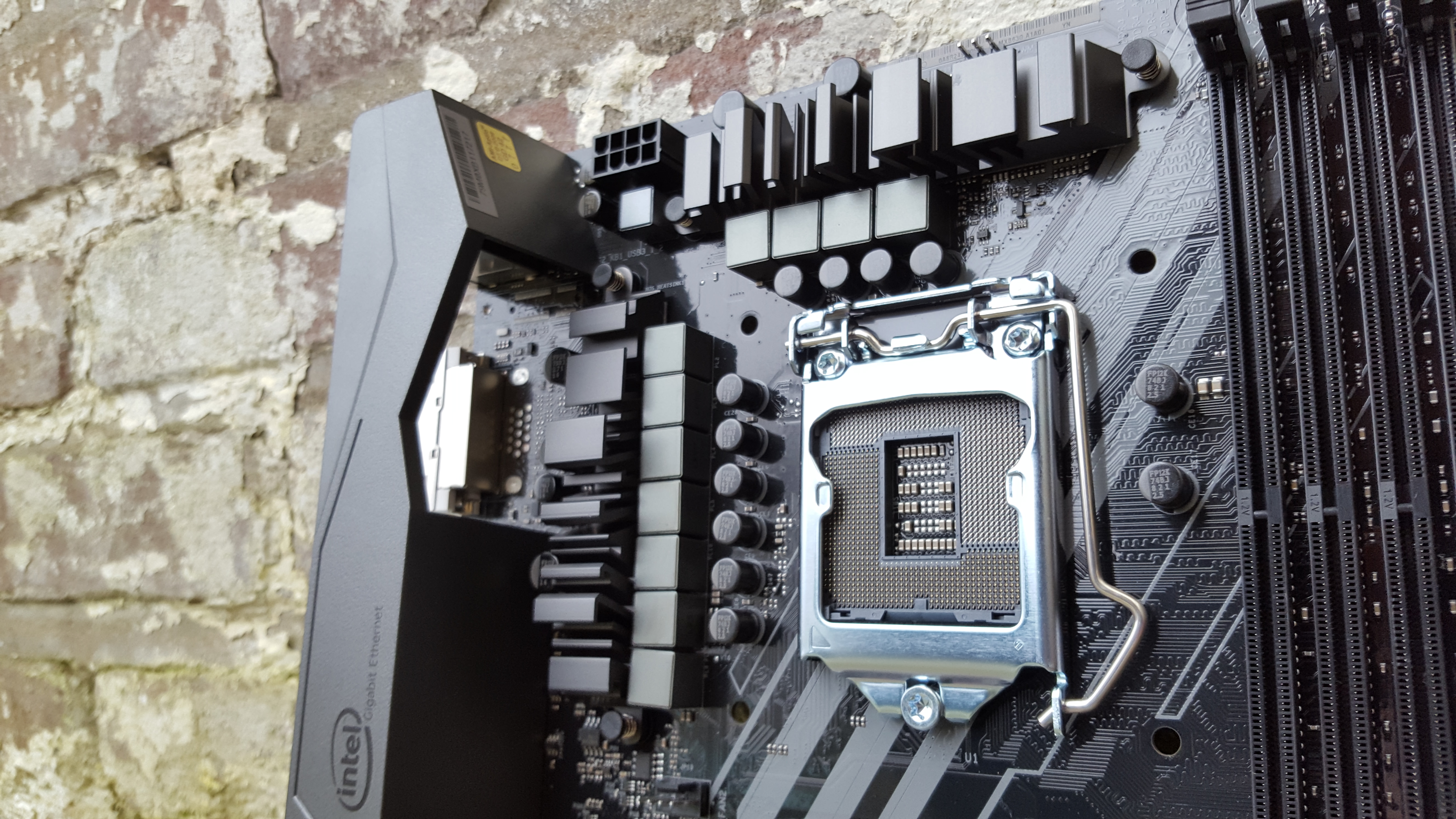 Aangekomen bij de socket, nummer 1151. We vinden 10 VRM’s rondom de socket, wat duidt op een 10-fase power design. Zoals eerder aangegeven vallen de heatsink qua vormgeving goed op. Deze zijn niet overdreven groot en komen gebalanceerd over met het totaaldesign.