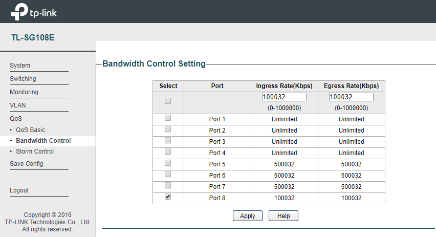 Met bandwidth control kan een up- en/of downloadlimiet (in Kbit/s) per poort worden ingesteld.