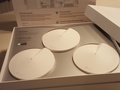 In de verpakking bevinden zich drie identieke repeaters of WiFi routers, voedingskabels, een ethernet kabel en een instructieboekje.