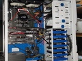 Toen moest de koelblok nog op de processor. Ik bekeek de handleiding en er zat een speciale Intel X vormige backplate bij die je aan de achterkant van je moederbord moet monteren met de bijbehorende schroeven. Echter, de gaatjes in mijn moederbord bij de CPU aan de achterkant kwamen niet overeen met de grote van deze backplate. Ik zat wederom met m'n handen in het haar. Ik dacht, hoe kan dit nu? Tig x die handleiding bekeken, ja, die X backplate moet op de achterkant van het moederbord en daarop moet die koeler bevestigd worden. Kwam ik later er pas achter dat mijn moederbord al een vaste backplate heeft. Dus deze was niet eens nodig. Pfeeww. Processor schoongemaakt, klein drupje koelpasta er op en volgens de handleiding moesten de slangen op een specifieke manier georiënteerd zijn. Als je een denkbeeldige lijn door beide slangen trekt moeten ze parralel lopen van voren naar achteren (in je kast). Dus ik monteer het koelblok, echter, die twee slangen liepen niet in die, laten we het zeggen, 6 uur's stand. Ze stonden eerder in de 5 voor 5 stand. Ik dacht alweer, nee he.. Wat nou weer? Dat betekende dus dat die bracket die je op de waterpomp draait, enkel draait, niet schroeft, zodanig moet oriënteren dat de beide slangen parallel lopen van voren naar achteren. Aangezien er geen markeringen waren aangebracht was het volledig trial en error hoe je de bracket op de koeler moest aanbrengen. Nou ja, goed, na 4 pogingen had ik em eindelijk juist georiënteerd en kon ik em vastschroeven. Het vreemde was wel dat het logo op het koelblok uiteindelijk op z'n kop staat, maar ik volgde gewoon de instructies, dus het zal wel goed zijn.