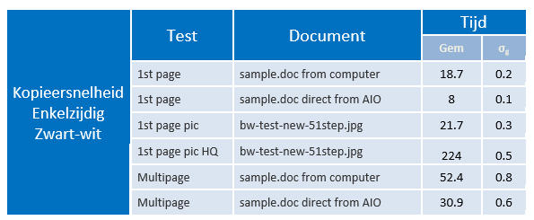 Bij de zwart wit picture test is de spreiding in de tijdsduur wat hoog want bij de tweede meting moest de multifunctional uit Standby komen.