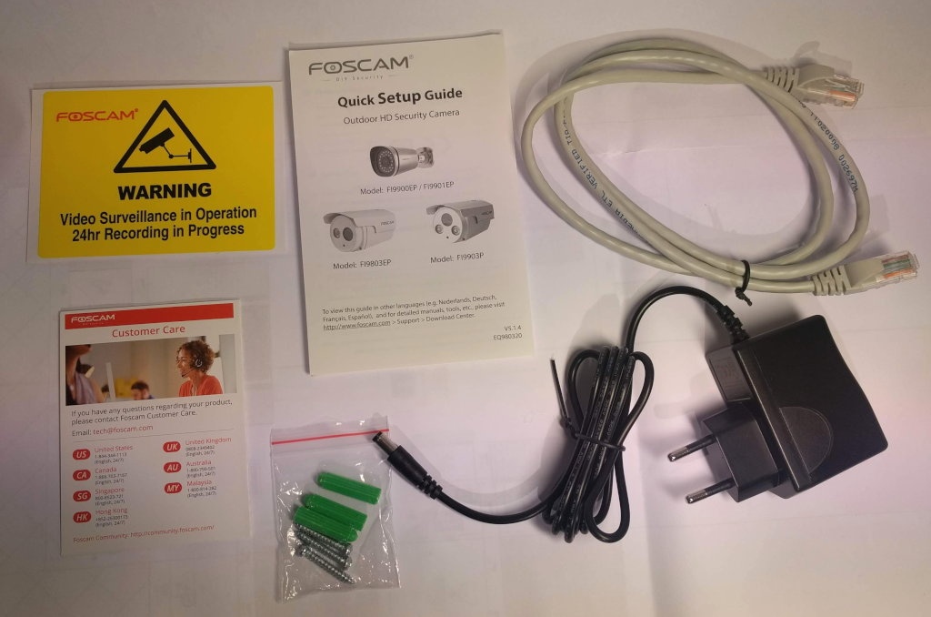 In de doos zelf kan je naast de camera nog een adapter vinden, een netwerkkabel, wat documentatie, schroefjes, pluggen en een inbussleuteltje.