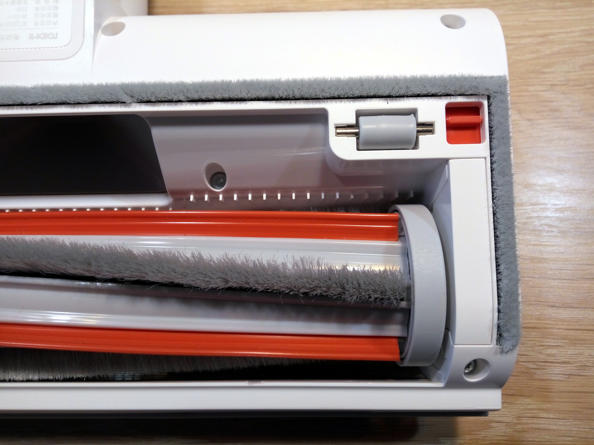 Om de roller te te vervangen of te verwisselen, duw je het oranje knop omlaag. Hierdoor komt er een wit plastiek houder los waardoor je de borstel kan uitnemen. Om alles terug vast te klikken plaats je dit terug en alles klikt gewoon vast.