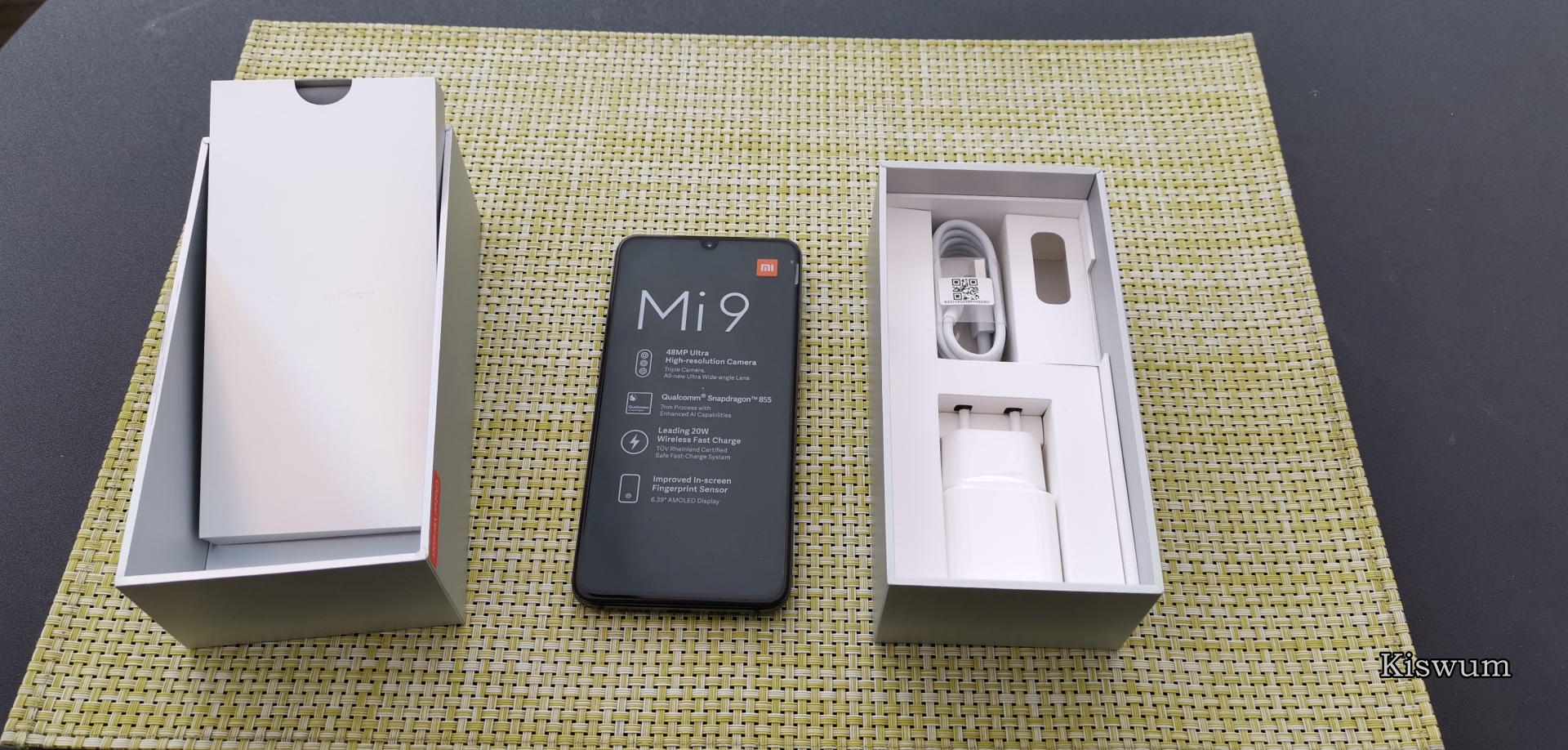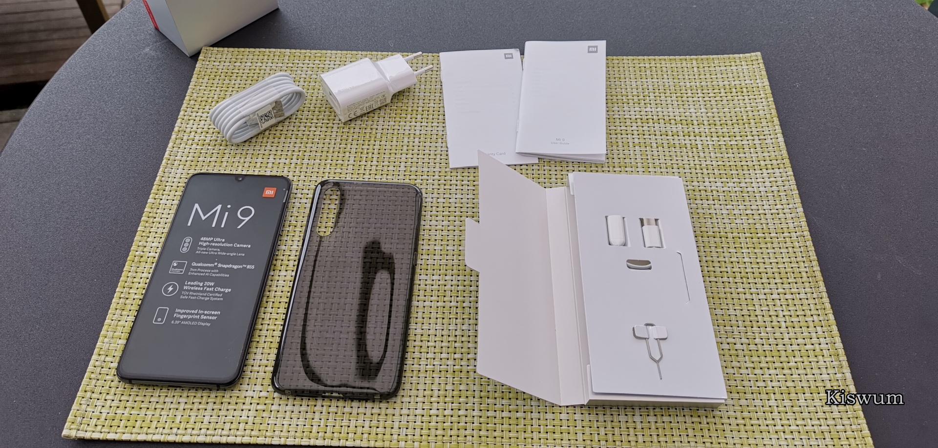 Bij het openen van de deksel zie je een kleiner doosje liggen. In dat doosje zijn de beschermhoes, usb-c naar 3,5mm converter, boekjes en de sim-tray te vinden. Onder het doosje bevindt zich de Xiaomi Mi 9 smartphone. Onder de smartphone vind je in het ene vakje de usb-c kabel en in het andere ligt de EU adapter met een maximale stroomdoorvoer van 18 watt. De smartpone kan 27 Watt aan en het is de vraag waarom Xiaomi niet zo'n snellader heeft toegevoegd.