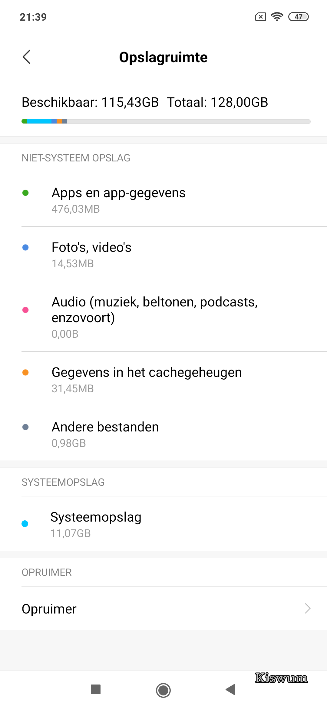 De telefoon is voorzien van 128GB intern opslaggeheugen en dat kan niet worden uitgebreid. Het systeem (met standaard apps) neemt ongeveer 15GB in beslag. Dankzij het 128GB opslaggeheugen kun je ongeveer 115GB gebruiken voor je eigen apps, games, documenten, foto's, filmpjes en muziek.