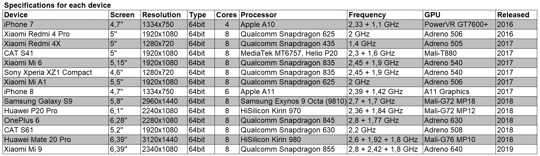 Klik op het onderstaande overzicht om de specificaties van de geteste apparaten te zien.