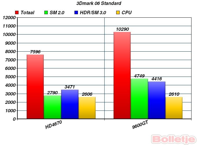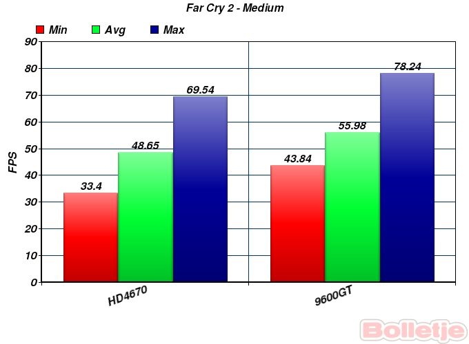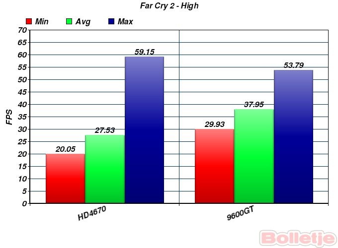 Zoals te zien presteert de 9600GT over de hele linie beter. Ik denk dat de hogere bandbreedte (256-bit interface) een grote invloed heeft. Deze is namelijk twee keer zo groot als die van de HD4670.