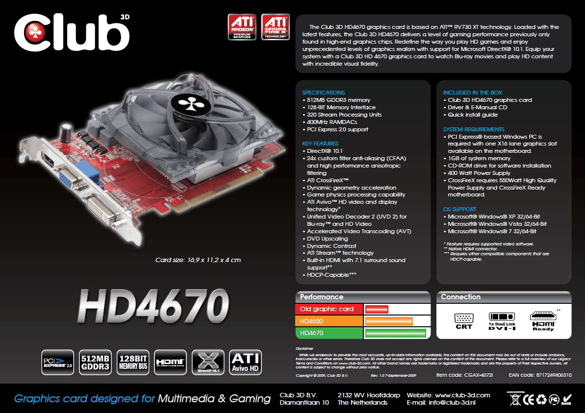 Het bedrijf begon eerst met ATI en is later ook overgestapt op NVIDIA. Veel kaarten volgen het reference design van zowel ATI als NVIDIA, maar Club3D heeft ook veel ‘eigen’ kaarten. Ze verschillen dan in koelers, PCB, kloksnelheden etc. Zo bespreken we vandaag de HD4670 waarvan er maar liefst 10 verschillende soorten zijn bij Club3D. De videokaart van vandaag draagt het typenummer CGAX-4672I.