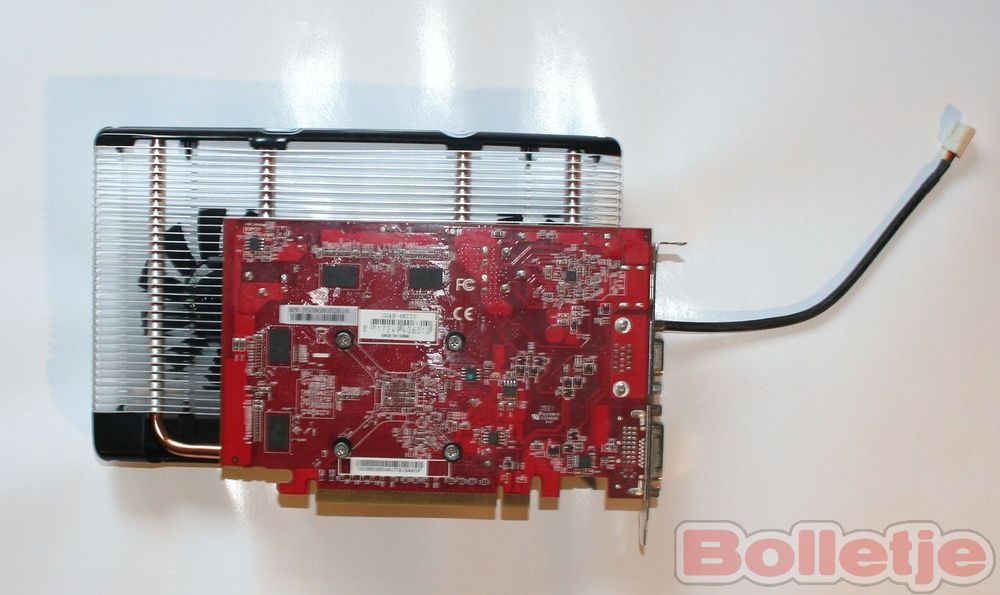 De koeler is in vergelijking met de kaart zelf redelijk groot. Het betreft hier namelijk een gemodificeerde L2 van Arctic Cooling. Deze koeler is iets minder dik dan de vrij verkrijgbare L2 Pro, waarschijnlijk omdat de HD4670 niet veel warmte produceert waardoor een grote koeler overbodig is. Desondanks neemt de videokaart dankzij deze koeler wel 2 uitbreidingssloten in beslag. Met z’n 17 cm is de videokaart kort te noemen. Hierdoor past hij zonder moeite in de meeste systemen.