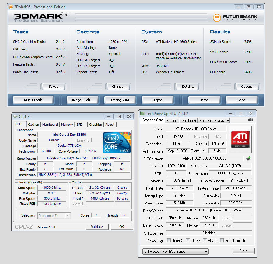 Het testsyteem bestaat uit een E6850, een P35-DS3P en 4GB DDR2 geheugen. Het zijn vrij simpele videokaarten, dus ze worden niet heel erg tegengehouden door dit systeem.