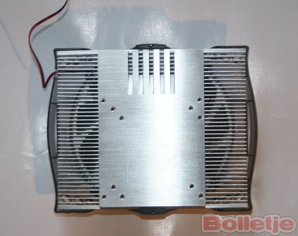 Ook zien we dat koeler meerdere schroefgaten heeft. Dit duidt aan dat deze koeler voor meerdere videokaarten wordt gebruikt (zowel ATI als NVIDIA).