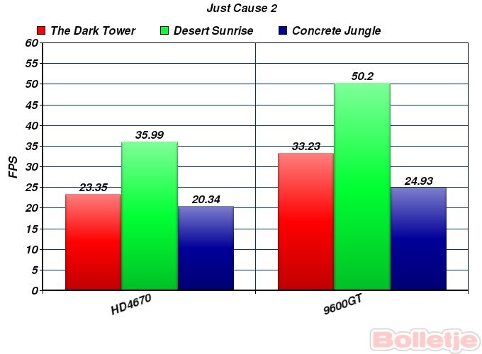 Just Cause 2 is nog niet zo heel lang op de markt. Dit spel kan alleen in DX10 gespeeld worden (mensen met Windows XP kunnen dit spel dus niet eens spelen!). Ook deze game heeft een ingebouwde benchmarktool met drie verschillende maps. De minimum en maximum FPS staan echter niet gegeven, alleen het gemiddelde.