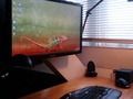 2. Naar mijn mening is het scherm prachtig vormgegeven. De rand glanst, het beeld zelf niet. De lijn aan de onderkant loopt heel iets uit in een bocht wat een extra toevoeging is aan het design. De knoppen zijn onzichtbaar en lichten op zodra je er op drukt. Enkel een zwak (voordeel) wit rond ledlichtje naast het aan/uit symbool geven aan dat de monitor aan staat. Ook de achterkant is prima, onopvallend en redelijk strak. Er had nog een paneel aan de onderkant mogen zitten, zoals bij sommige synchmasters, om de kabelaansluitingen te verbergen maar op de manier waarop ik het scherm gebruik heb ik hier geen last van.