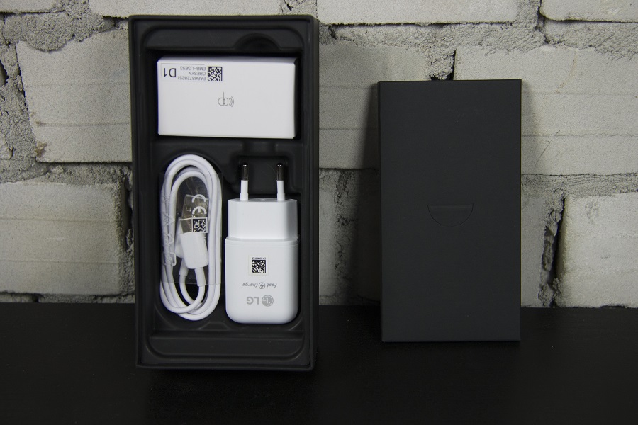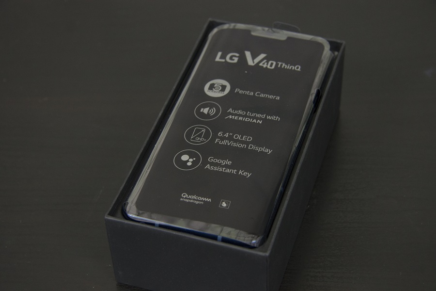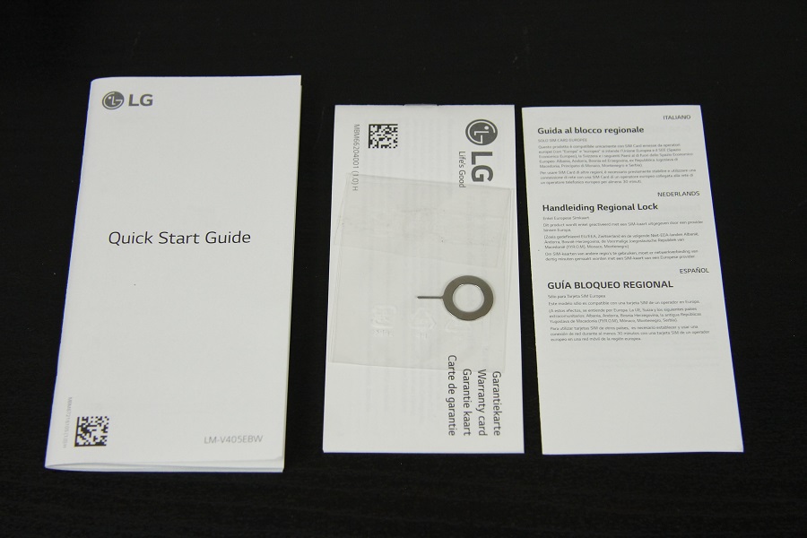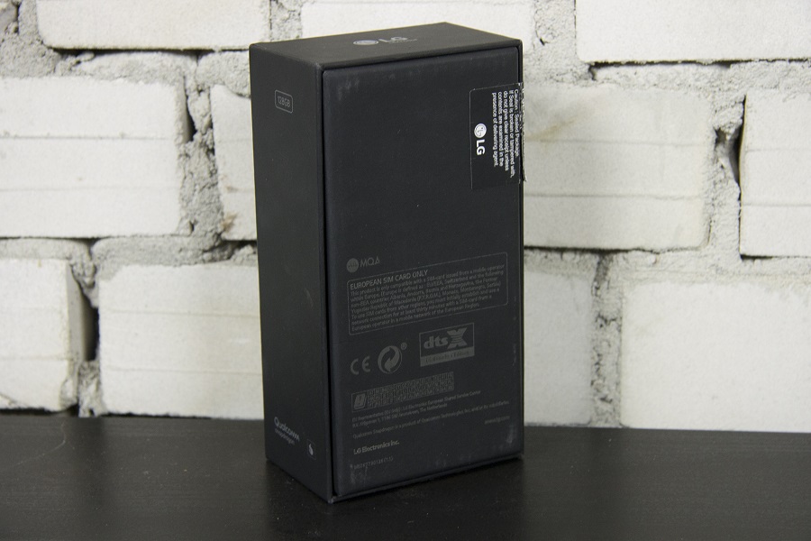De voorkant is vrij sober uitgevoerd. Uitvoering: Zwart met in het midden het typenummer van het toestel. Aan de achterkant van het doosje vinden we een waarschuwing dat het toestel alleen maar voor Europese simkaarten is gemaakt. Ook is hier het logo te vinden van DTS:X wat ondersteund wordt door het toestel. Maken we het doosje vervolgens open dan zien we een doekje zitten om vingerafdrukken van het scherm af te vegen. Vingerafdrukken op een glanzend scherm zijn tegenwoordig onvermijdelijk, dus wel mooi dat LG hier rekening mee houdt. Halen we deze weg, dan zien we een folie zitten met daarop wat features die op het toestel aanwezig zijn. Denk hierbij aan de camera, het OLED scherm, de Google Assist en het geluid wat door Meridian onder handen is genomen.