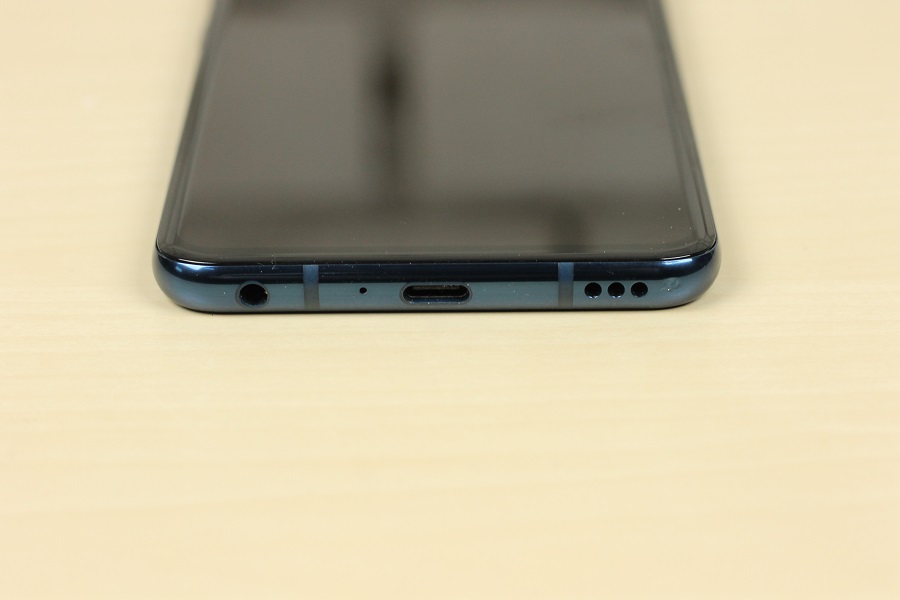 De achterkant van deze variant is uitgevoerd in het blauw maar het toestel is in meerdere kleuren te krijgen, te weten zwart, zilver en rood. Aan de onderkant staat het merk vermeld en in het midden van het toestel staat het typenummer. Boven het typenummer zit de vingerafdrukscanner in een ronde vorm. Bij mijn eigen Oneplus 6 is dit een rechthoekig vlak. Tegenwoordig zijn de scanners niet eens meer te zien omdat deze achter het scherm geplaatst worden. Boven de scanner vinden we de drie verschillende camera's en een enkele LED flitser. Rechts op het toestel zit de knop om het toestel aan of uit te zetten. Links daarvan zit het slot om de simkaarten in te plaatsen of een Micro SD kaart voor extra opslag. Aan de bovenkant is een extra microfoon te vinden voor het dempen van het omgevingsgeluid. Links zijn drie knoppen geplaatst: de twee linker knoppen zijn voor het aanpassen van het volume, de rechter knop is bedoeld om de Google Assistent op te roepen. Onderop vinden we als laatste een 3.5mm audio aansluiting, de microfoon, de USB Type-C connector en de speaker.