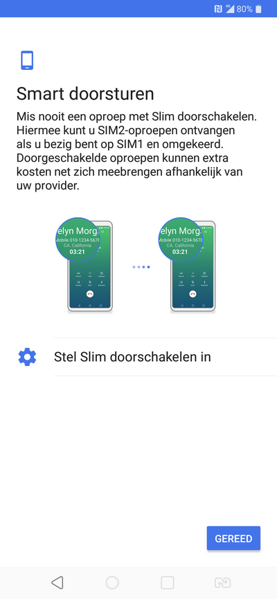 In de volgende schermen komen we de instellingen tegen van de vingerafdruk scanner en de Google Assist knop. Bij de eerste moet je een aantal keer je vinger laten scannen zodat je het toestel kan ontgrendelen met je vingerafdruk. Natuurlijk is dit ook over te slaan als je hier geen gebruik van wilt maken. Daarna moet er aangegeven worden welke instellingen je aan wilt zetten voor Google Assist. Let wel: hoe meer er aan staat, hoe meer er opgeslagen wordt op de servers van Google. Dan komen we bij de voorwaarden aan die je moet accepteren om gebruik te kunnen maken van het toestel. Doe je dit niet, kan je het toestel niet gebruiken. De laatste optie is wel een handige: je kunt de gesprekken van de ene SIM kaart door laten sturen naar de andere SIM kaart. Normaal gesproken hoor je niet dat je nog een gesprek binnen krijgt, maar op deze manier krijg je wel een signaal dat er een gesprek binnen komt op het andere nummer. Nadat deze instelling is opgeslagen kan er gebruik gemaakt worden van de telefoon.