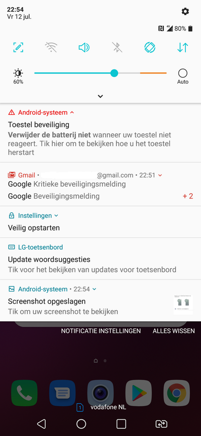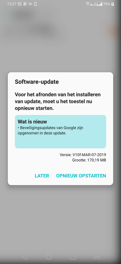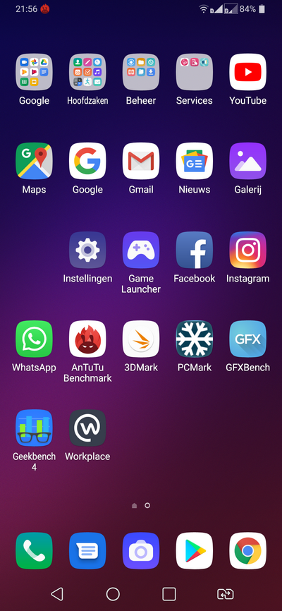 Over Android gesproken: dit toestel werd geleverd met Android 8.1 Gelukkig is er in de tussentijd een nieuwe software update uitgekomen voor het toestel. Maar goed ook, want meerdere mensen hebben in het verleden al aangegeven dat het update beleid van LG nog wat te wensen over liet. Om de software bij te werken kan het update center bezocht worden. Daar kan je zowel de applicaties als de software bijwerken. En inderdaad, er was een update beschikbaar voor deze telefoon. Werk alles bij en herstart het toestel: Voila, Android 9. Houdt er wel rekening mee dat de "veilig starten" optie ingeschakeld staat. De code die je met de installatie in hebt gegeven moet je nu dus ook invoeren voordat de telefoon op kan starten. Nadat de telefoon opnieuw is opgestart, zijn een aantal dingen wel aangepast binnen de software van de telefoon. Sowieso is te zien dat Facebook en Instagram zijn toegevoegd aan de lijst met applicaties. Of dit nu zo'n verbetering is, weet ik niet. Deze applicaties willen nog wel eens data doorsturen, zelfs als je geen account hebt.